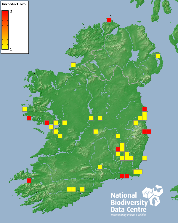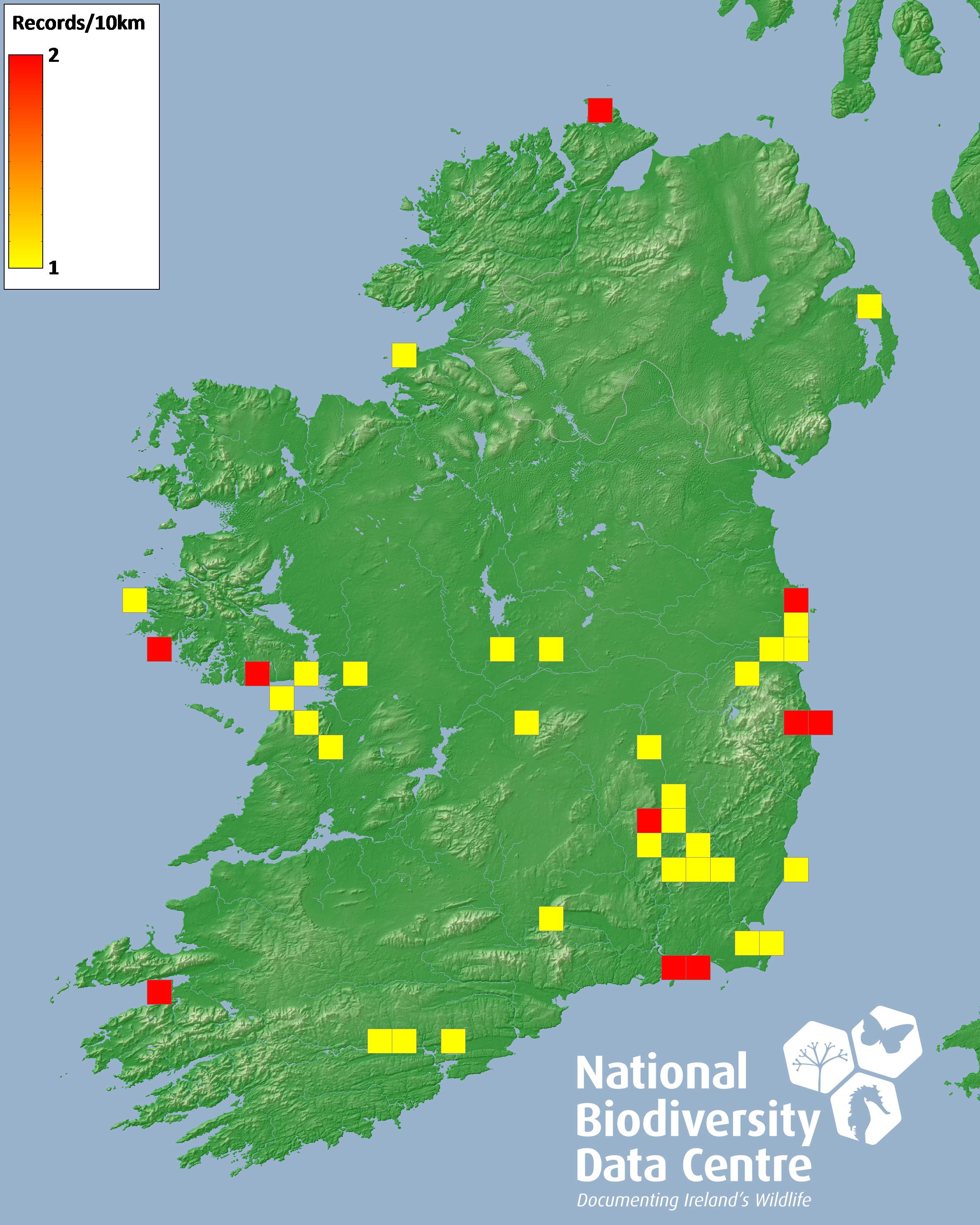 Distribution of the number of records recorded within each 10km grid square (ITM).Marine Map - 50km