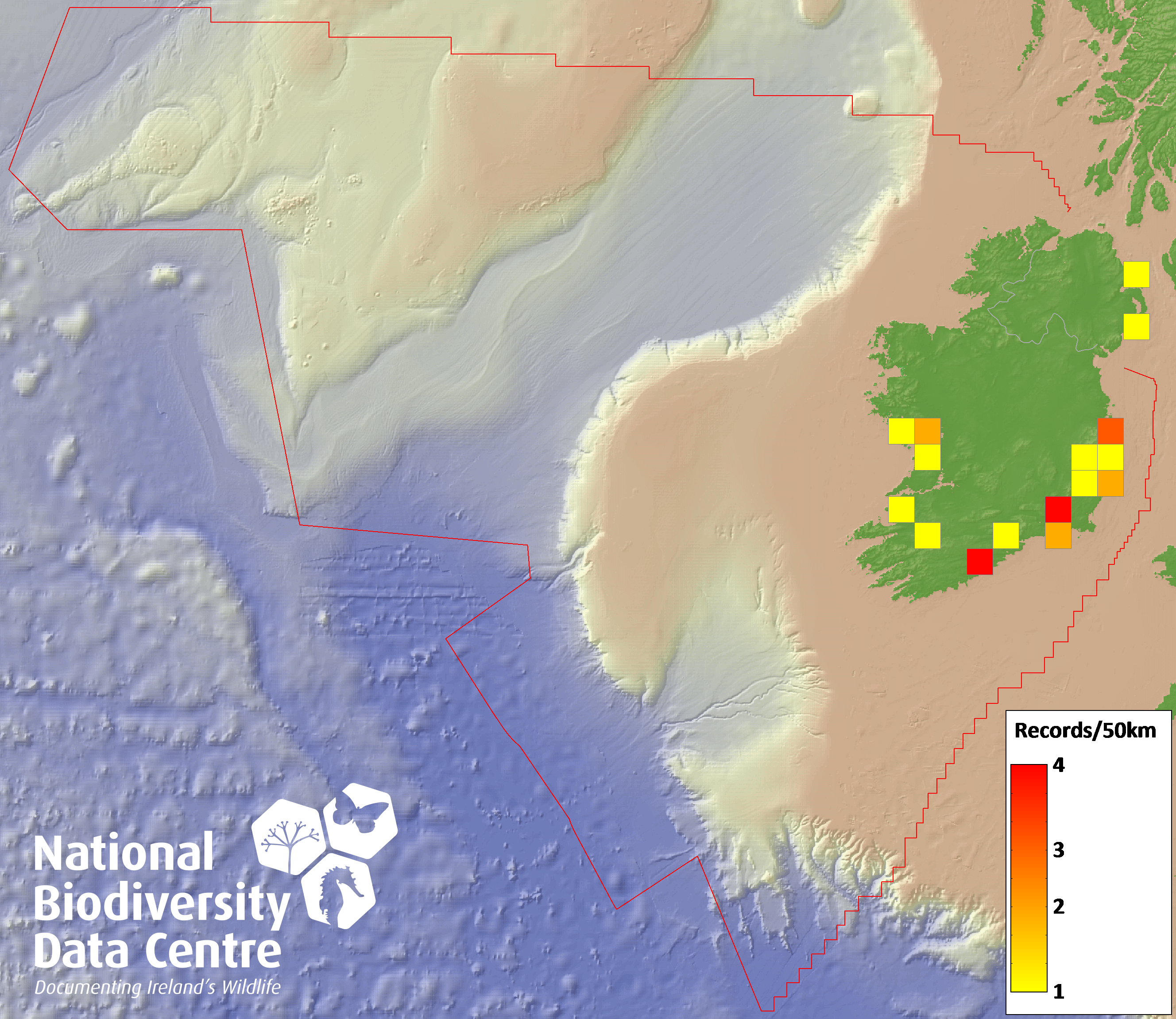 Distribution of the number of records recorded within each 10km grid square (ITM).Marine Map - 50km