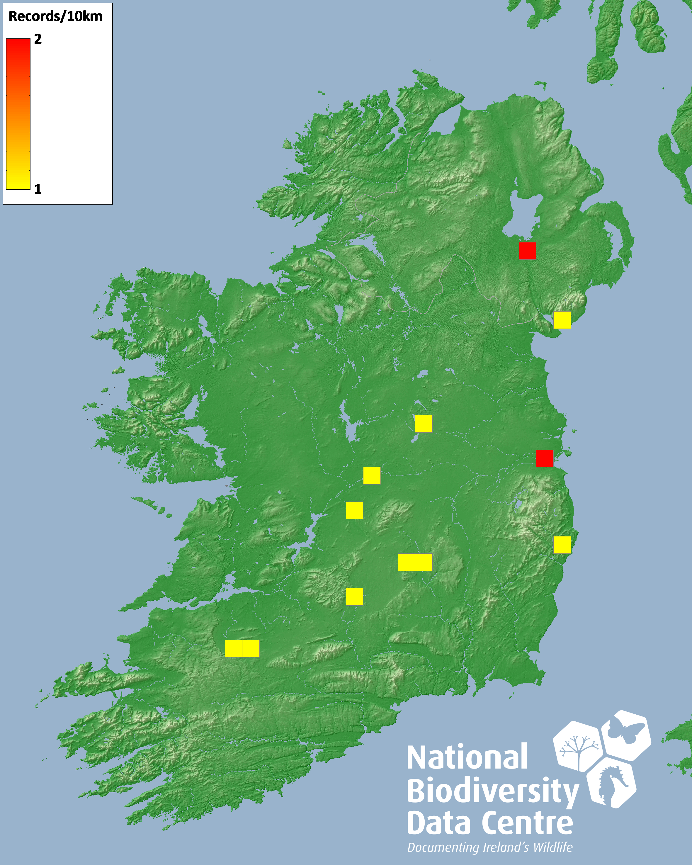 Distribution of the number of records recorded within each 10km grid square (ITM).Marine Map - 50km