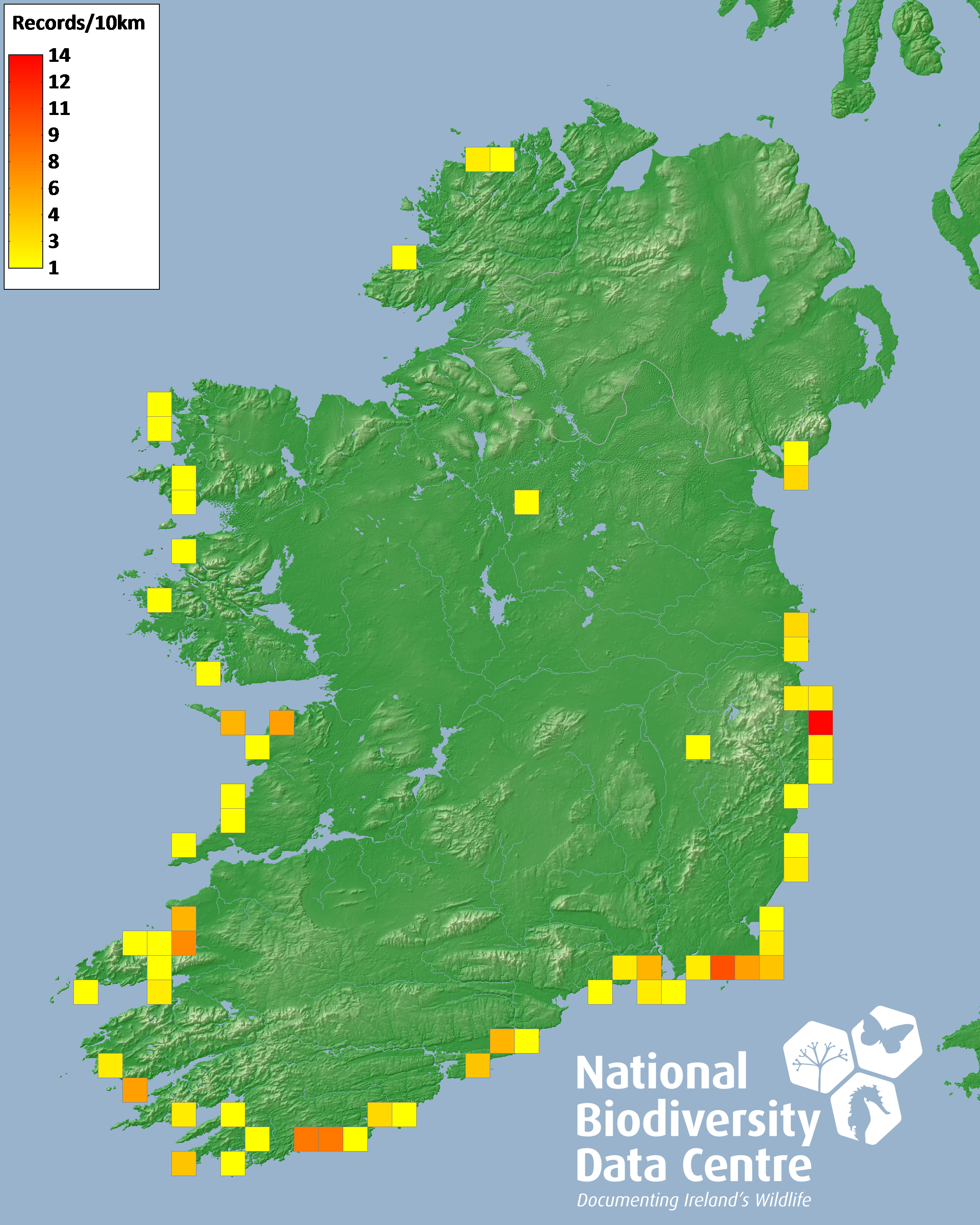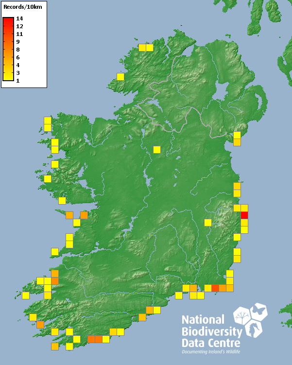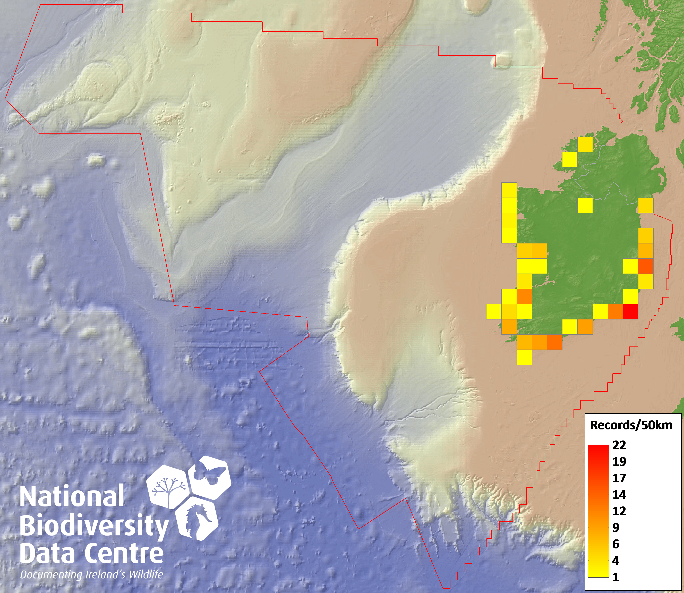 Distribution of the number of records recorded within each 10km grid square (ITM).Marine Map - 50km