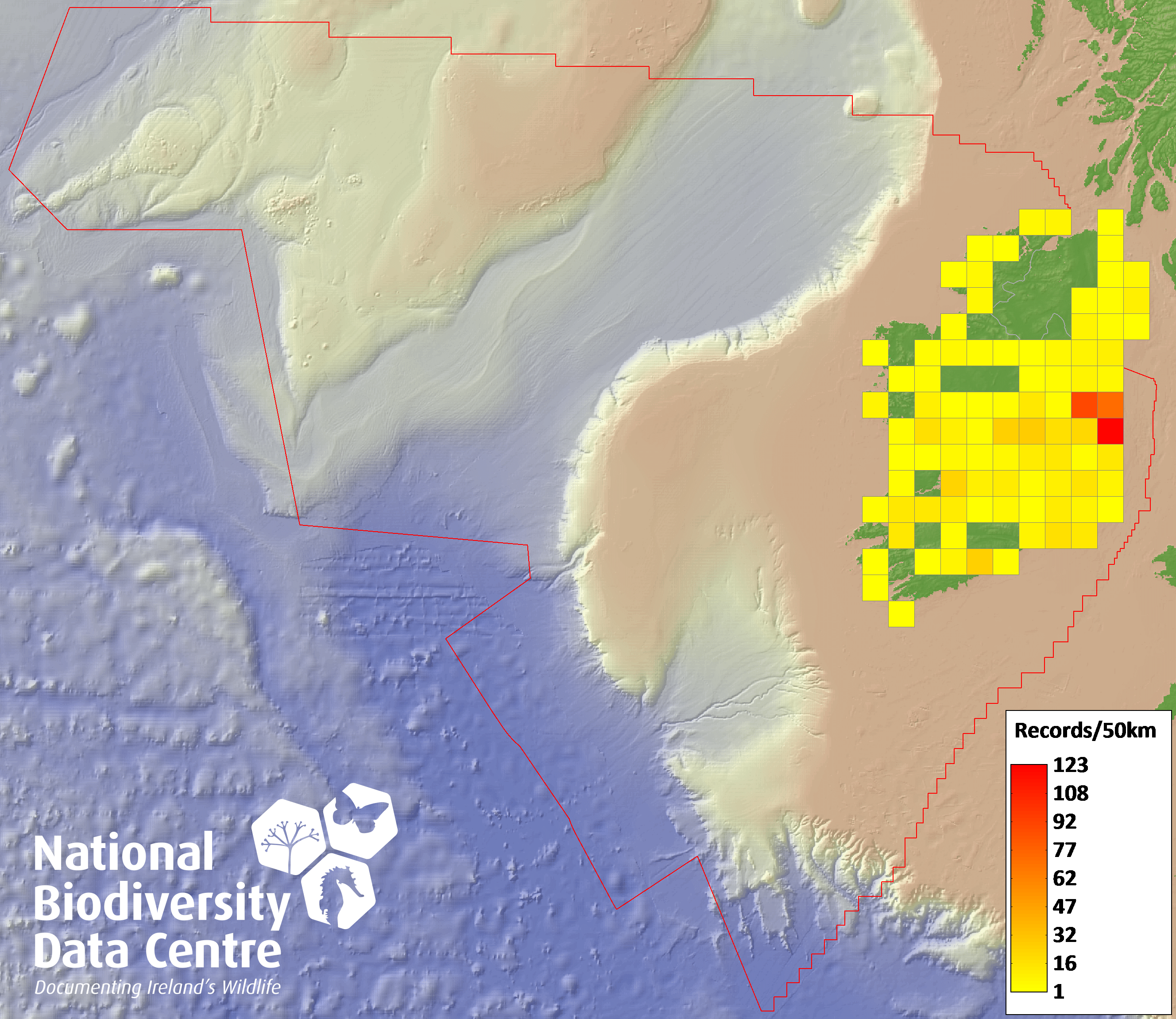Distribution of the number of records recorded within each 10km grid square (ITM).Marine Map - 50km