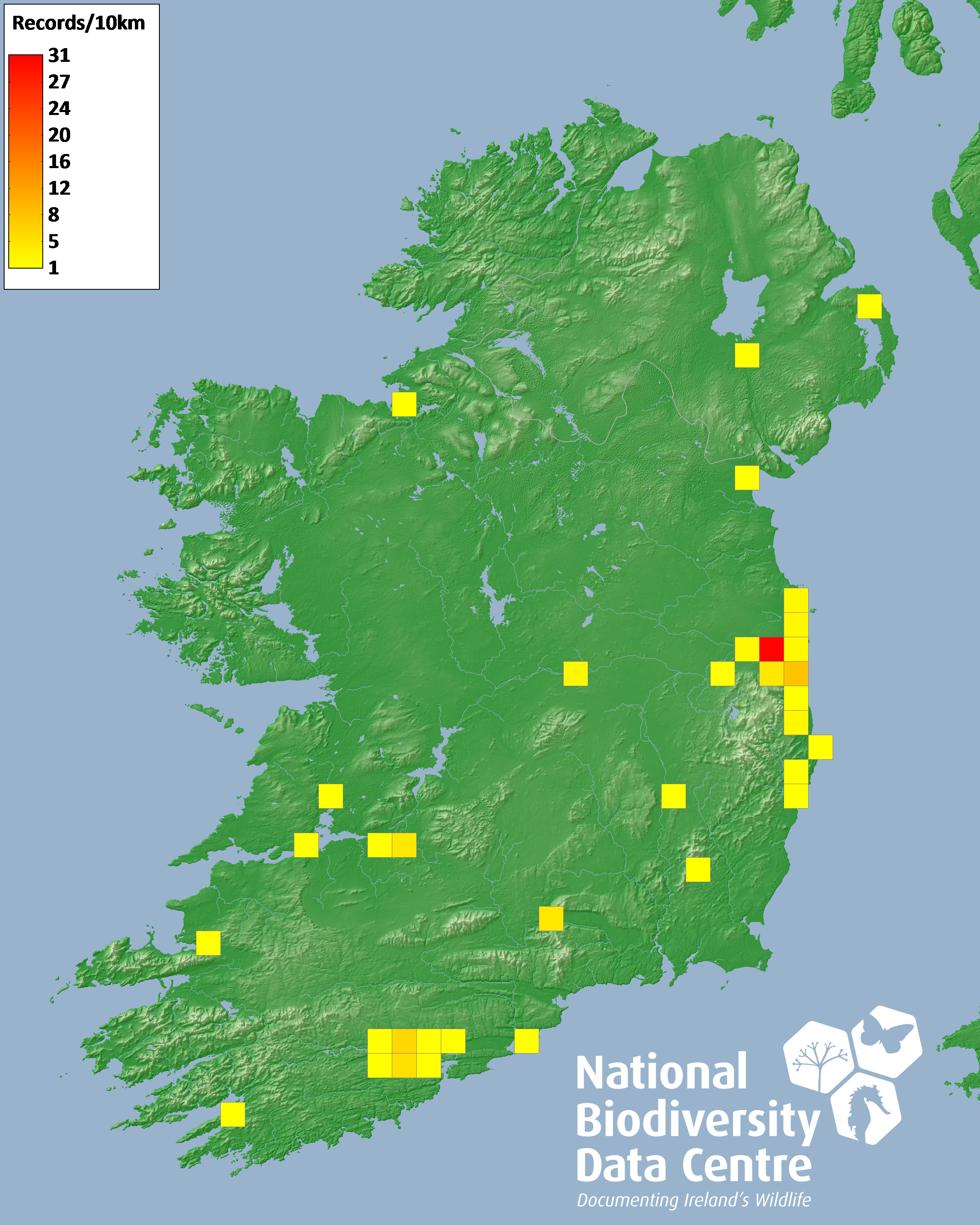 Distribution of the number of records recorded within each 10km grid square (ITM).Marine Map - 50km