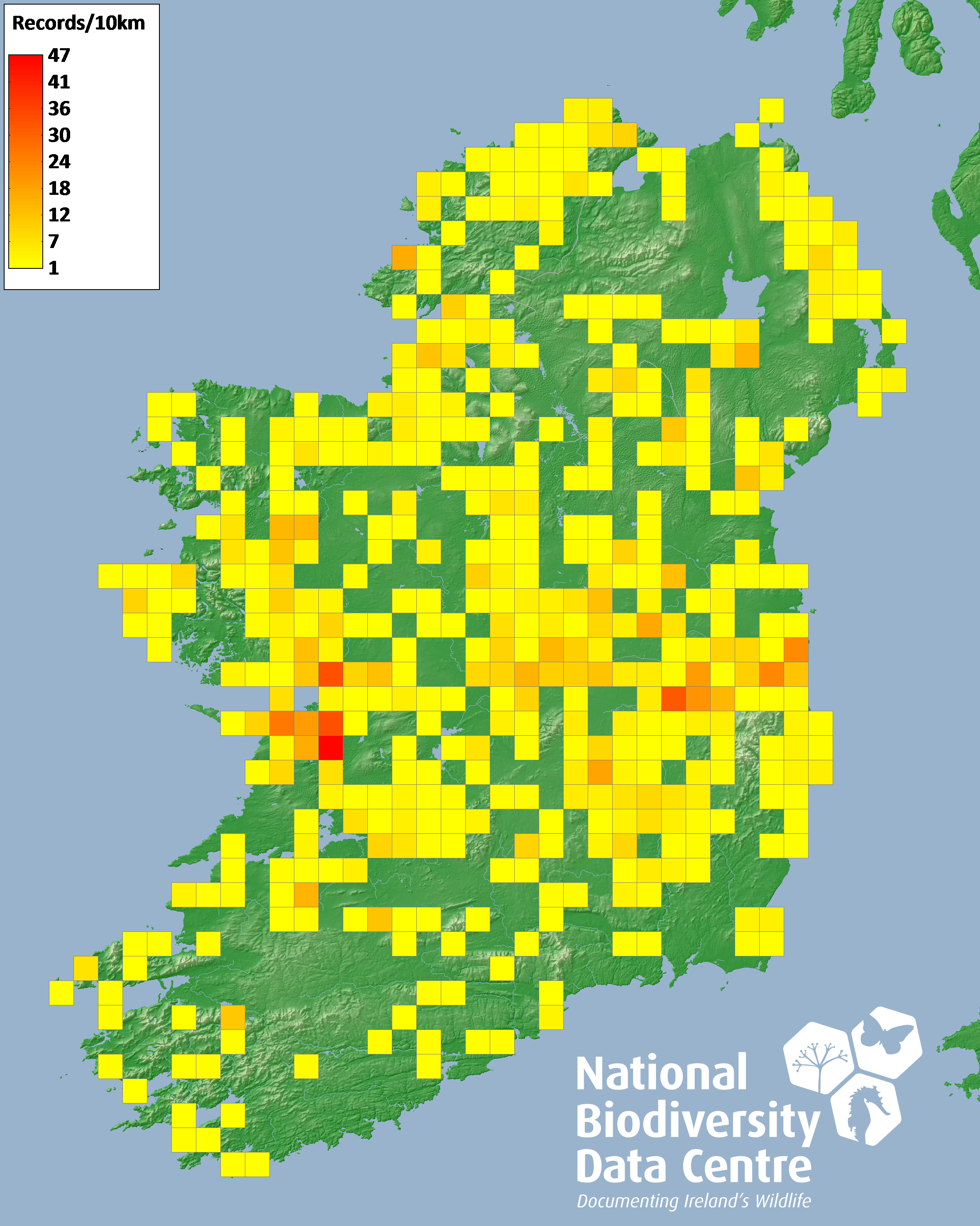 Distribution of the number of records recorded within each 10km grid square (ITM).Marine Map - 50km
