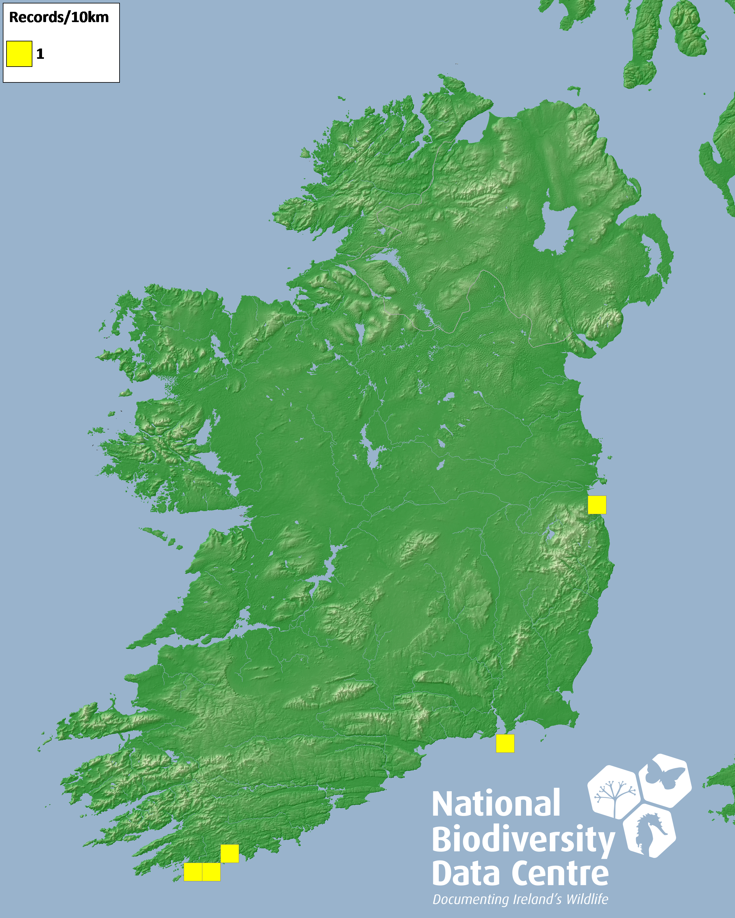 Distribution of the number of records recorded within each 10km grid square (ITM).Marine Map - 50km