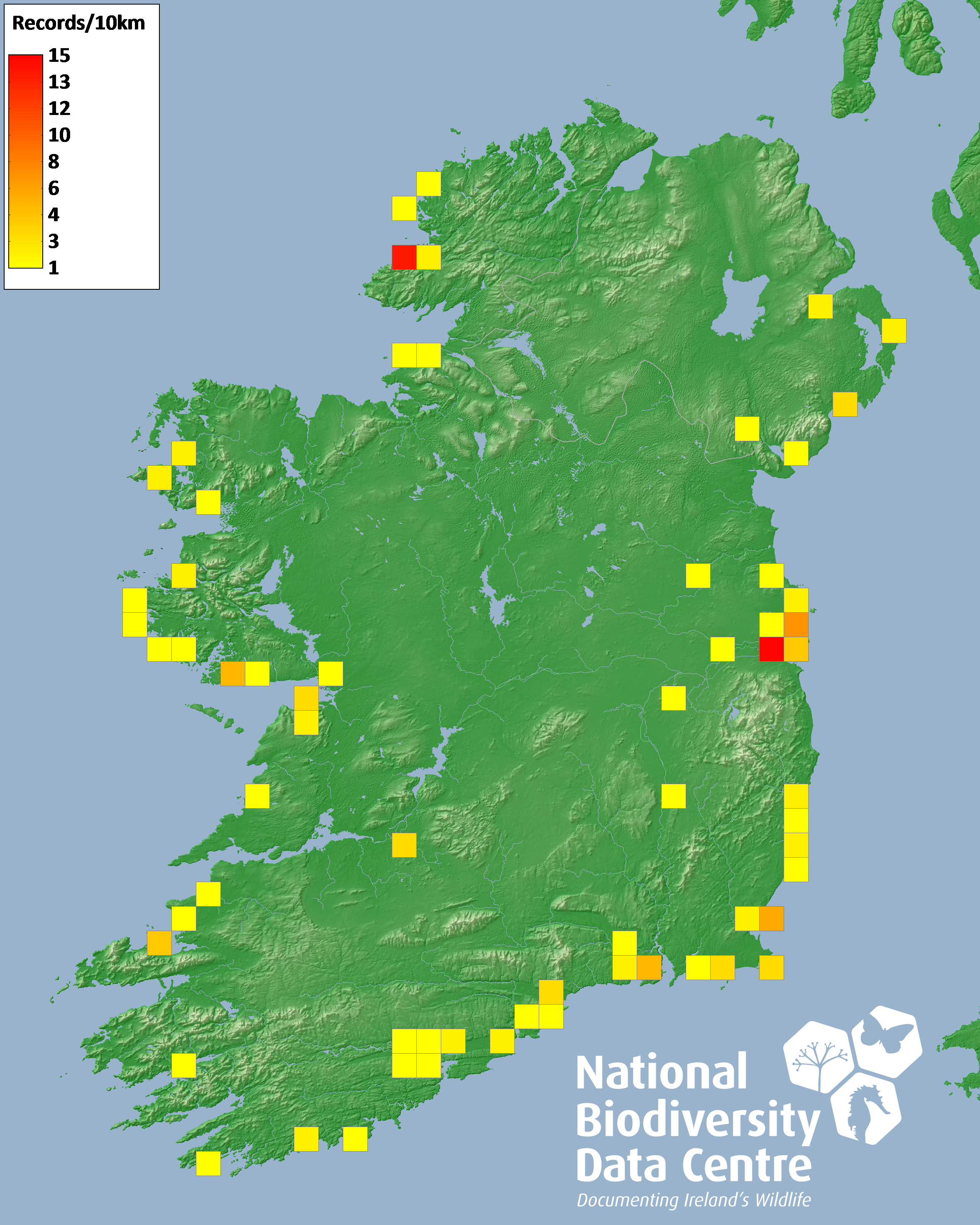 Distribution of the number of records recorded within each 10km grid square (ITM).Marine Map - 50km