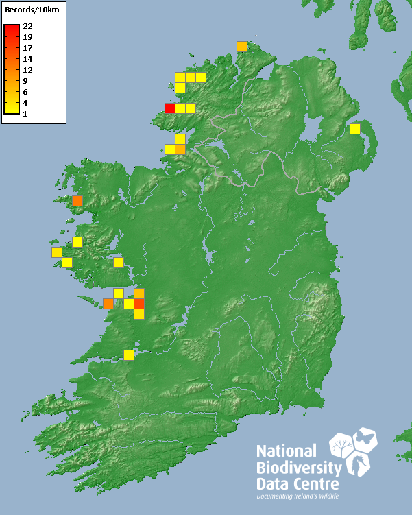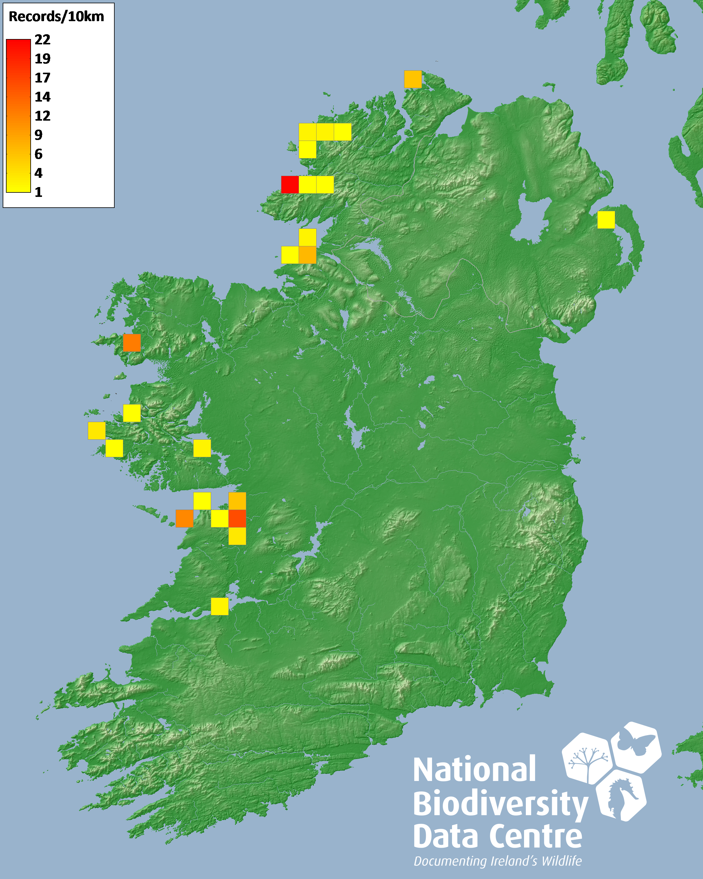 Distribution of the number of records recorded within each 10km grid square (ITM).Marine Map - 50km