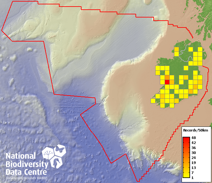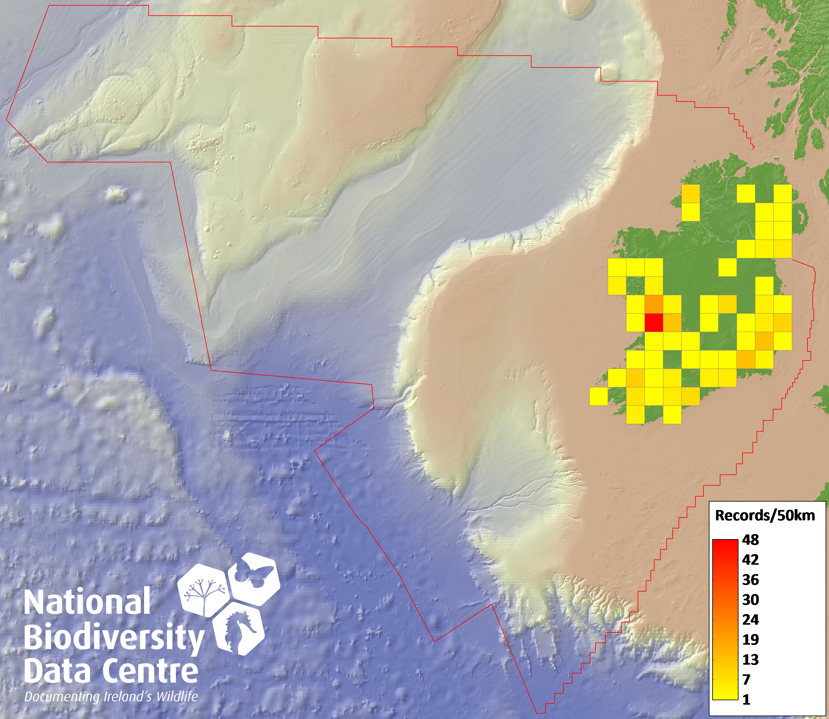 Distribution of the number of records recorded within each 10km grid square (ITM).Marine Map - 50km