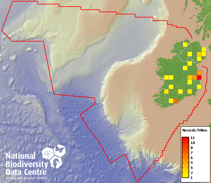 Distribution of the number of records recorded within each 10km grid square (ITM).Marine Map - 50km