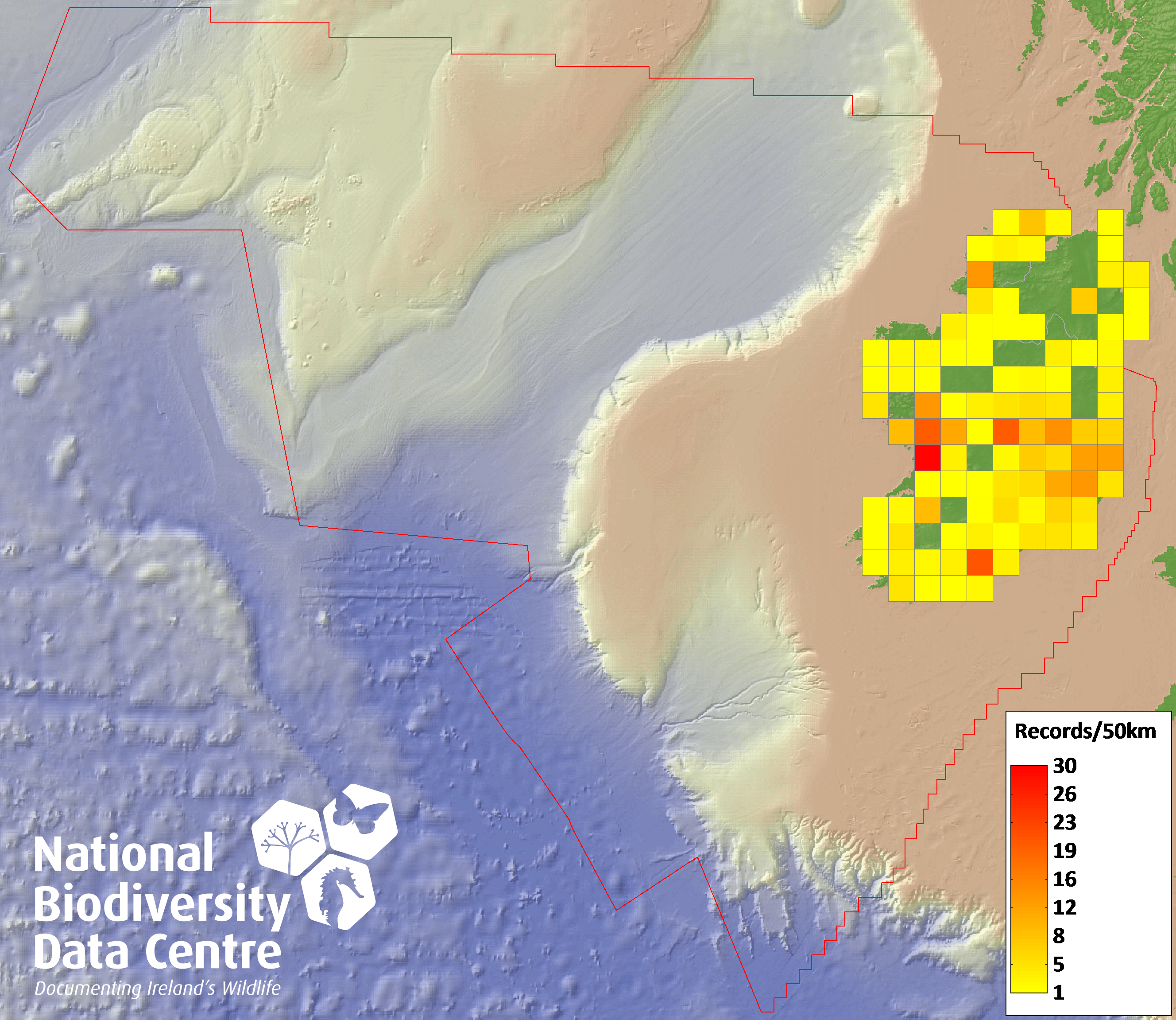 Distribution of the number of records recorded within each 10km grid square (ITM).Marine Map - 50km