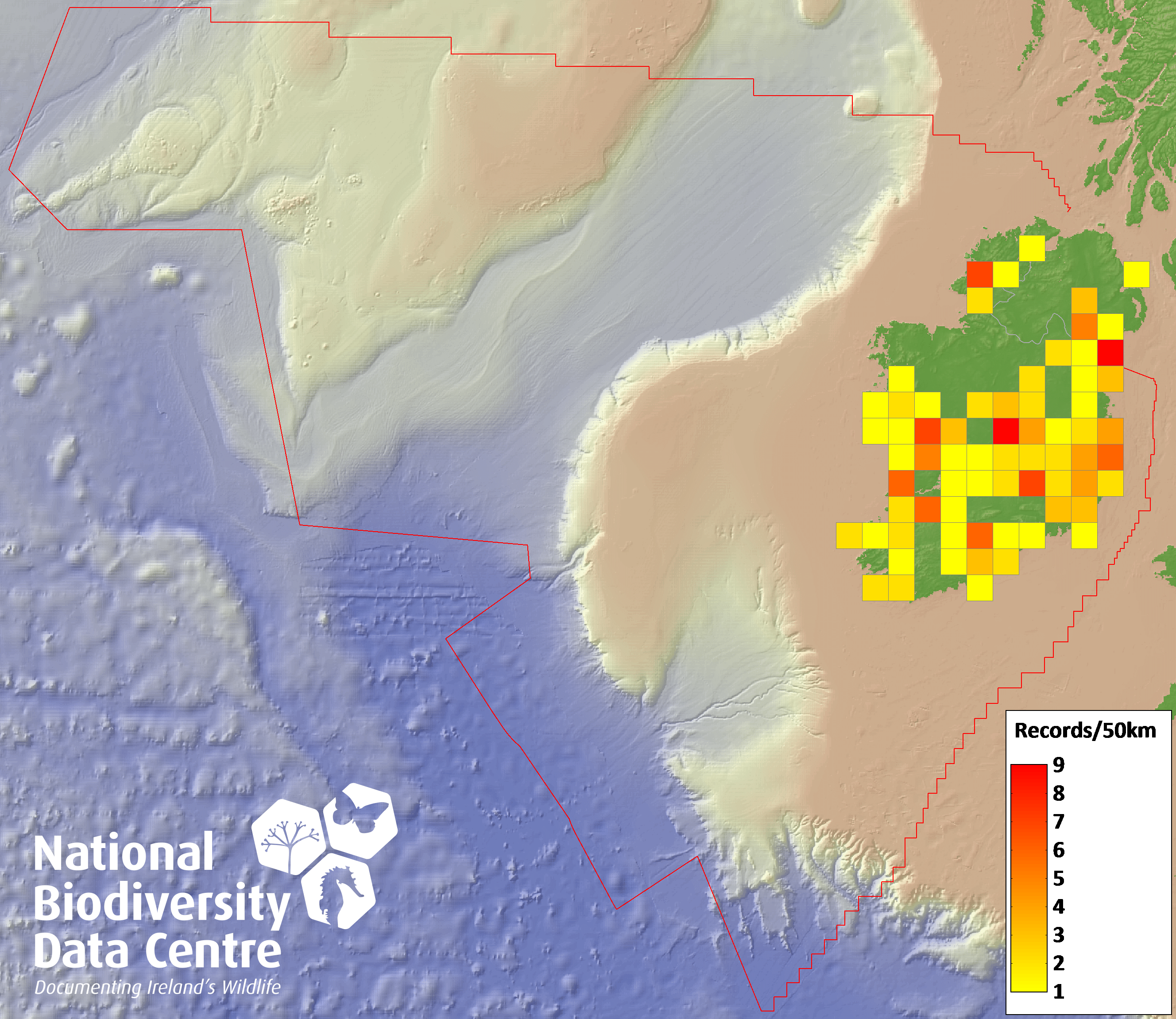 Distribution of the number of records recorded within each 10km grid square (ITM).Marine Map - 50km