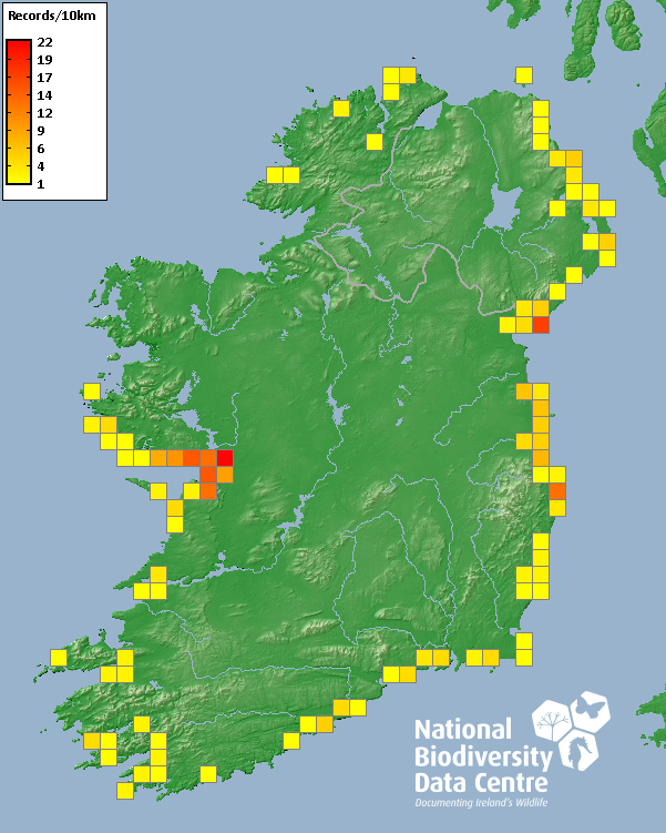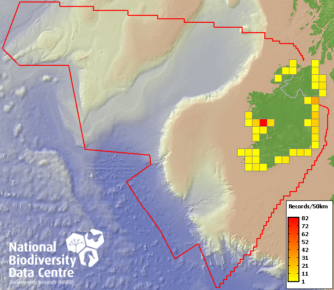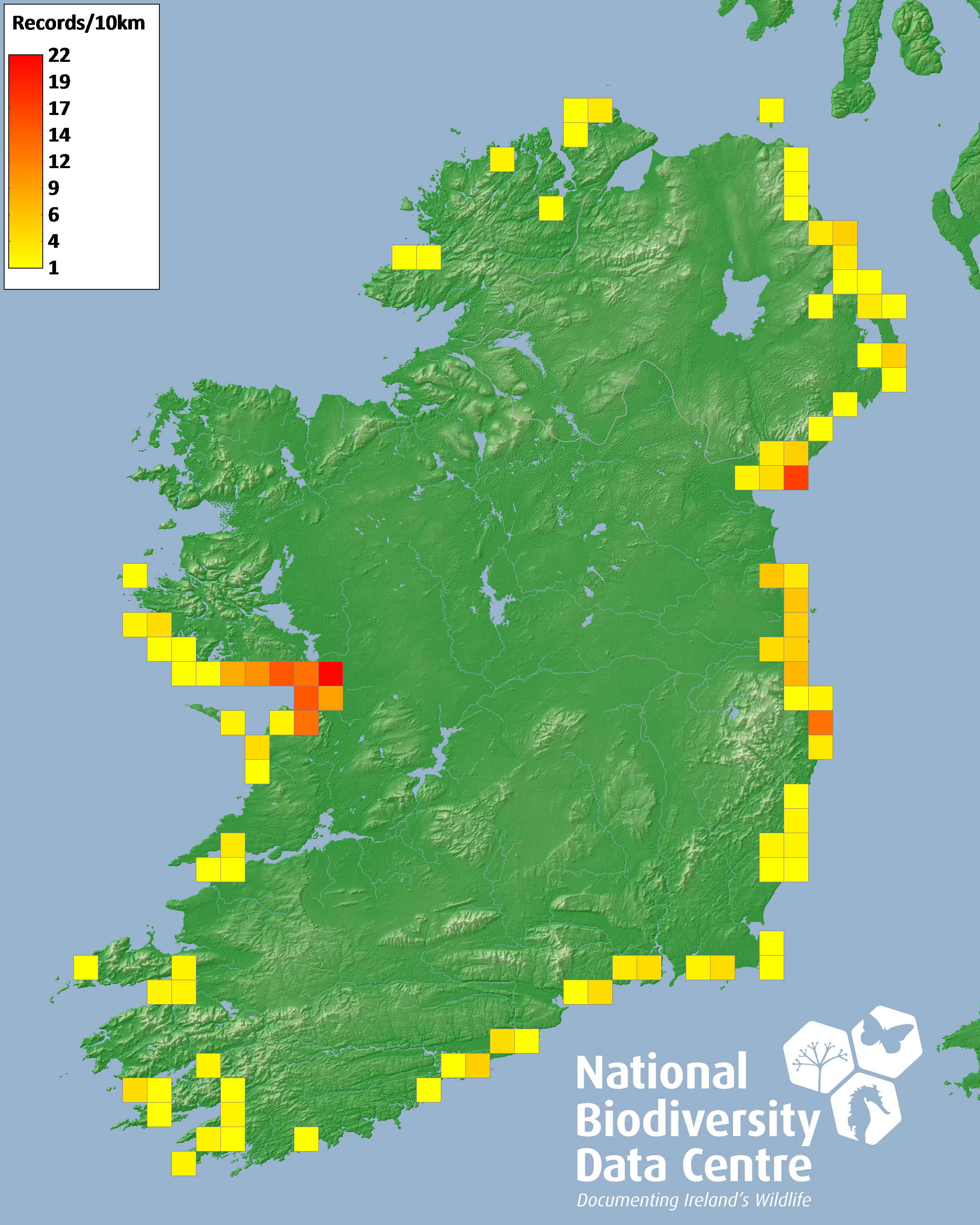 Distribution of the number of records recorded within each 10km grid square (ITM).Marine Map - 50km