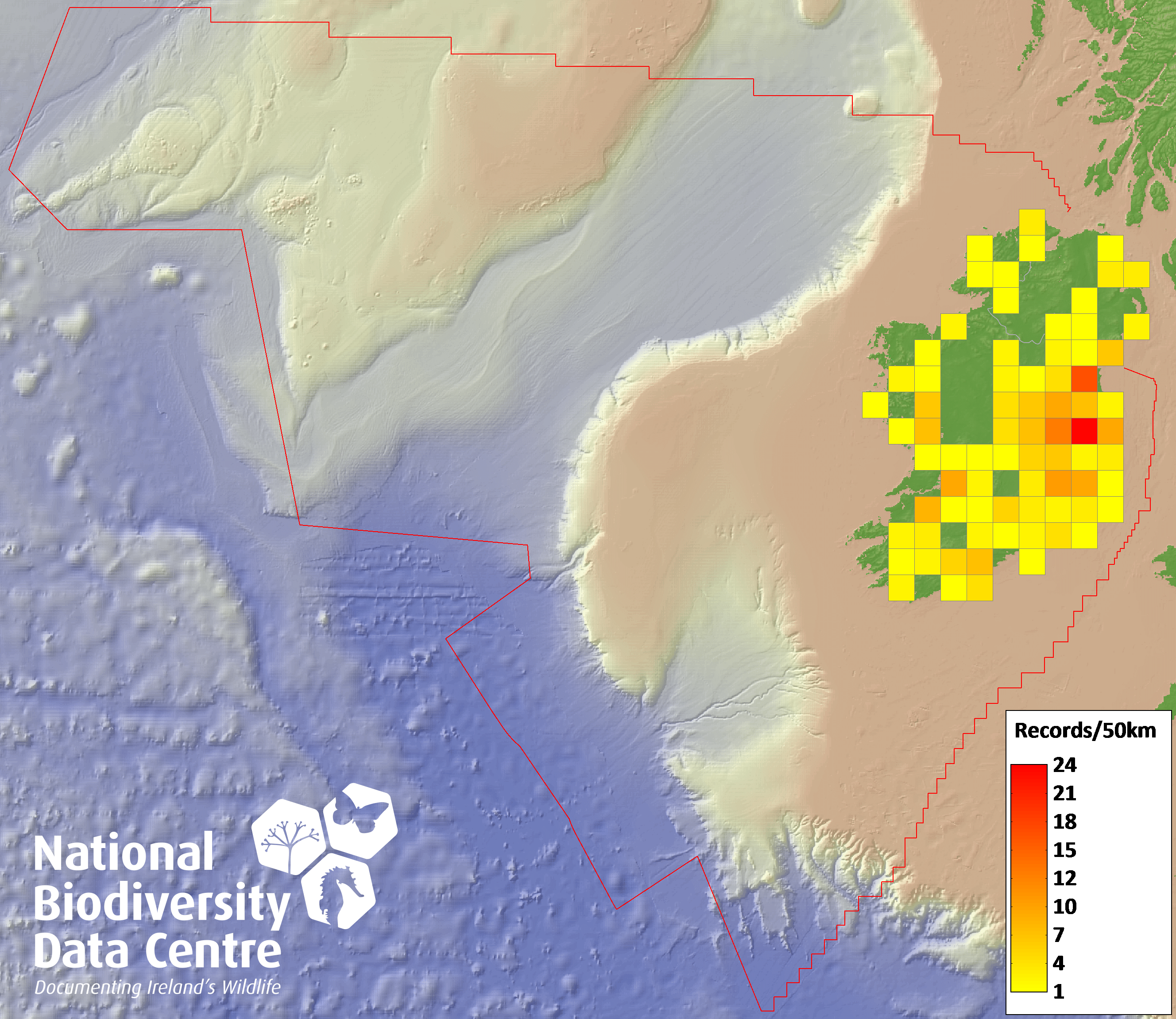 Distribution of the number of records recorded within each 10km grid square (ITM).Marine Map - 50km