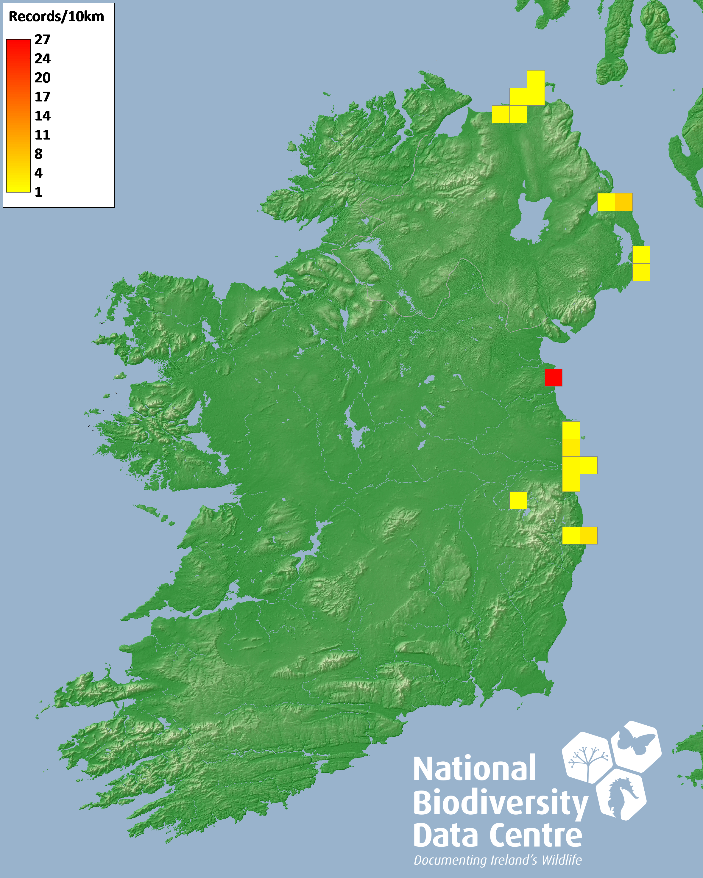 Distribution of the number of records recorded within each 10km grid square (ITM).Marine Map - 50km