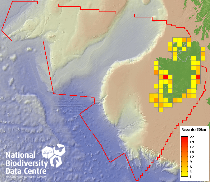 Distribution of the number of records recorded within each 10km grid square (ITM).Marine Map - 50km