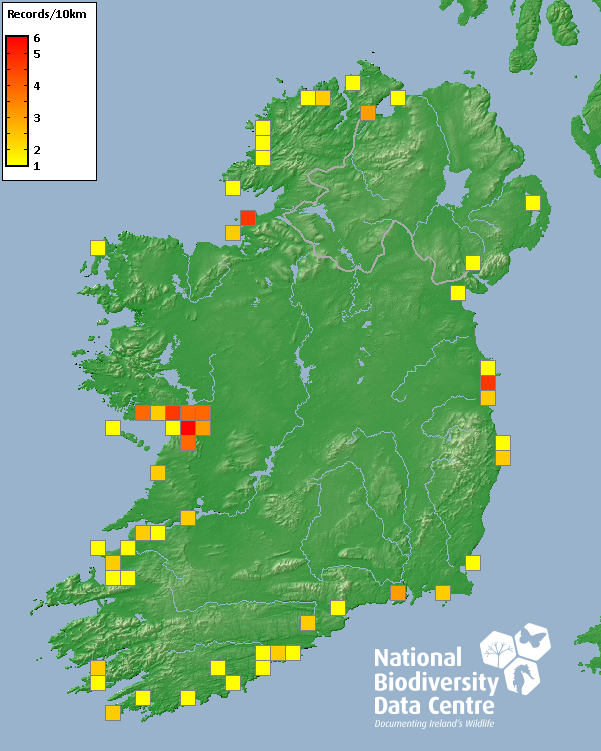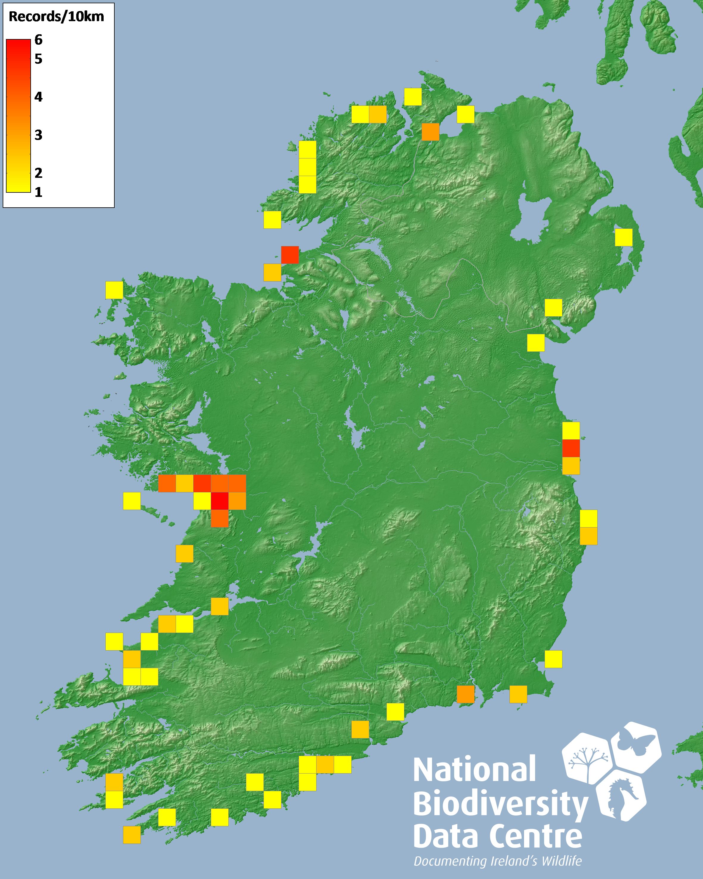 Distribution of the number of records recorded within each 10km grid square (ITM).Marine Map - 50km