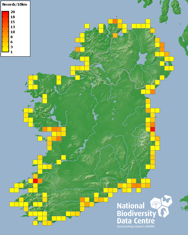 Distribution of the number of records recorded within each 10km grid square (ITM).Marine Map - 50km