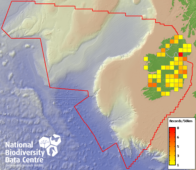 Distribution of the number of records recorded within each 10km grid square (ITM).Marine Map - 50km