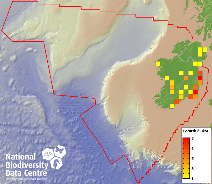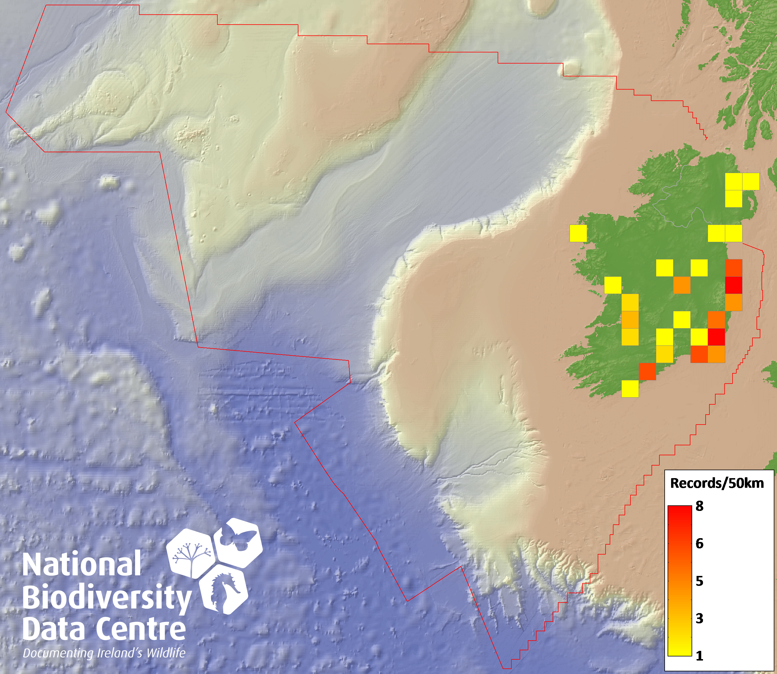 Distribution of the number of records recorded within each 10km grid square (ITM).Marine Map - 50km