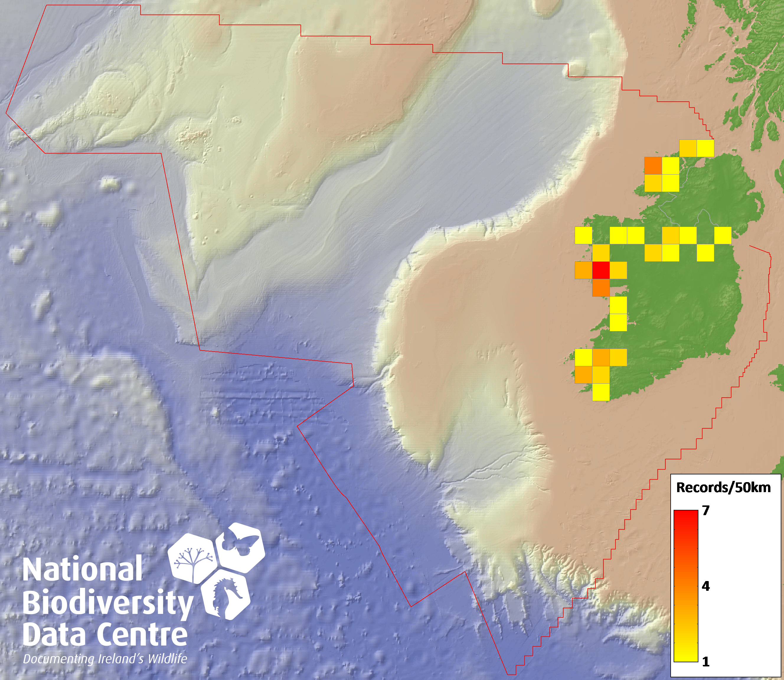 Distribution of the number of records recorded within each 10km grid square (ITM).Marine Map - 50km