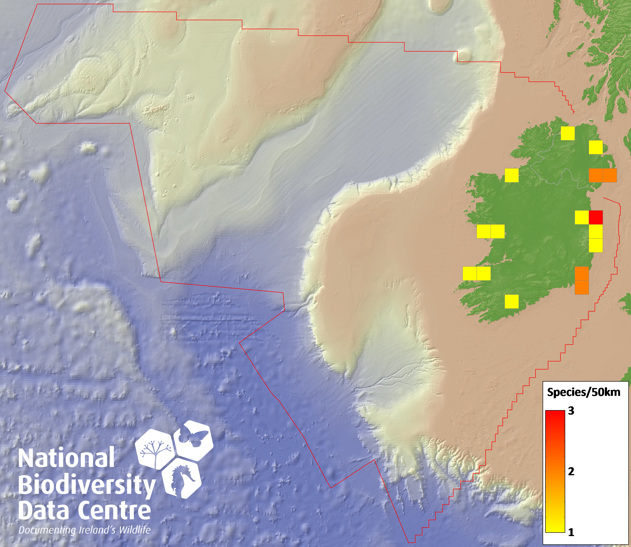 Distribution of the number of records within each 10km grid square (ITM).Marine Map - 50Km