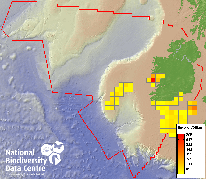 Distribution of the number of records recorded within each 10km grid square (ITM).Marine Map - 50km