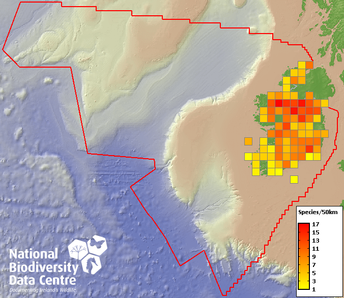Distribution of the number of species recorded within each 10km grid square (ITM).Marine Map - 50Km