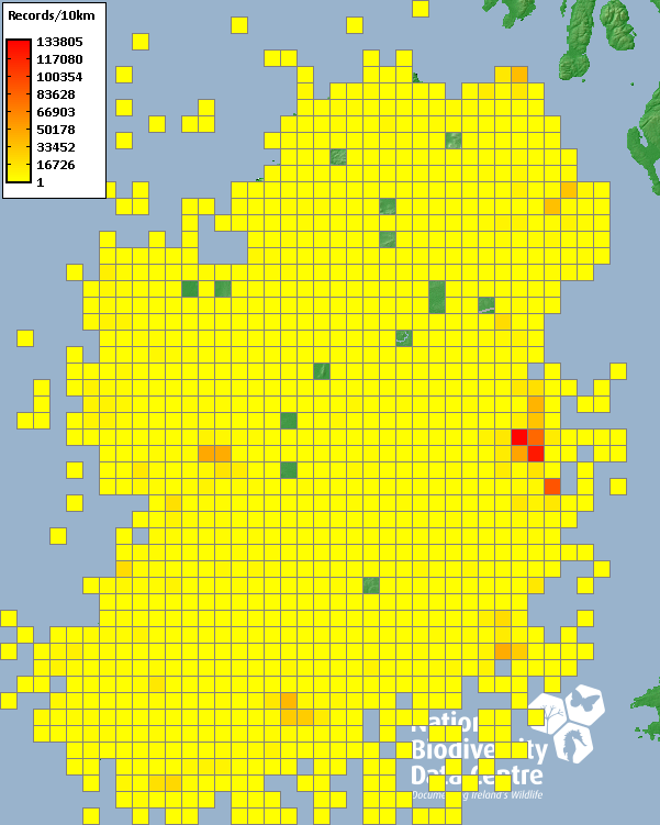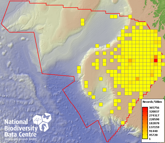 Distribution of the number of records within each 10km grid square (ITM).Marine Map - 50Km