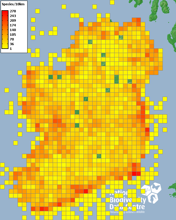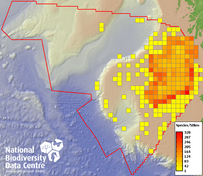 Distribution of the number of species recorded within each 10km grid square (ITM).Marine Map - 50Km