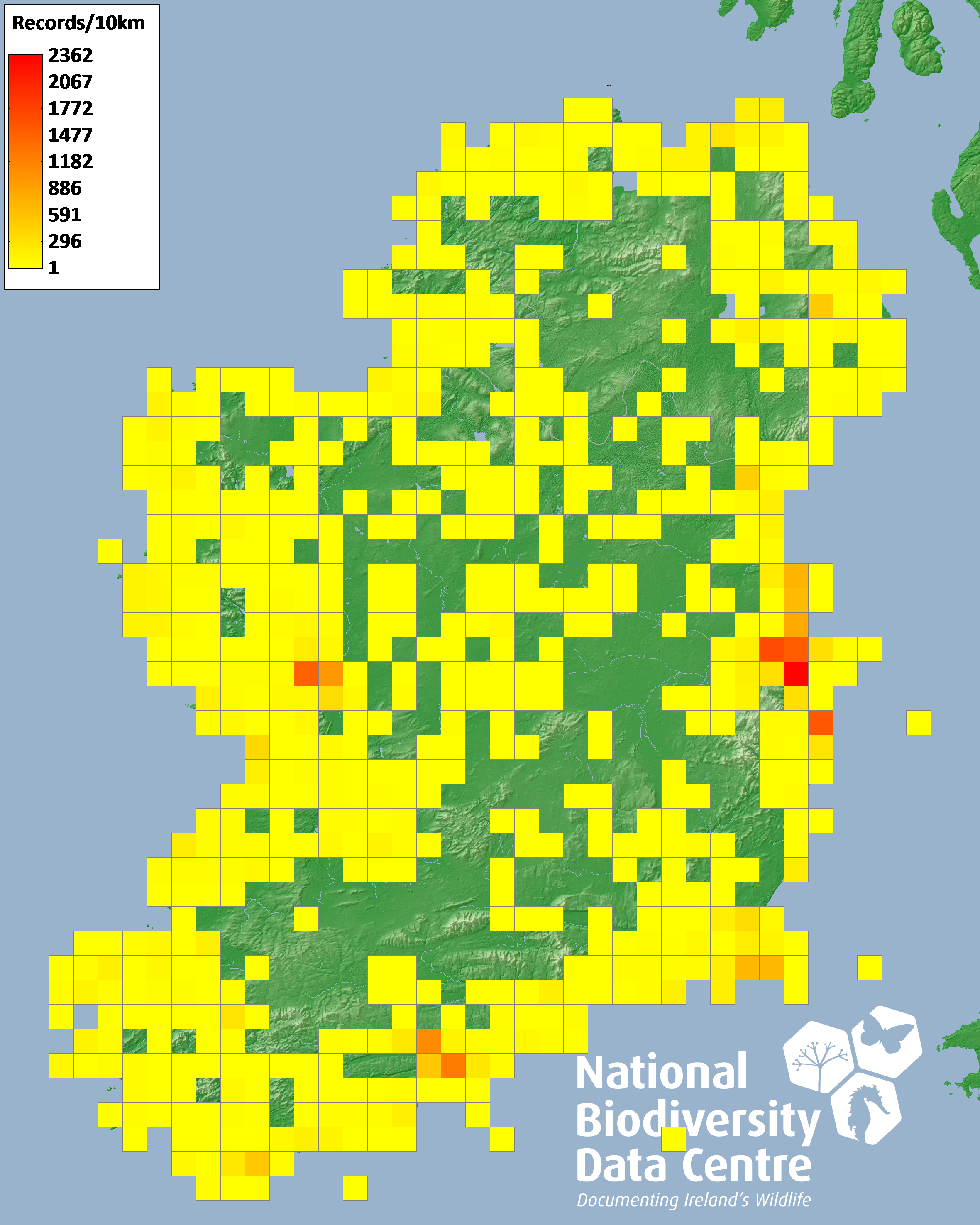 Distribution of the number of records recorded within each 10km grid square (ITM).Marine Map - 50km