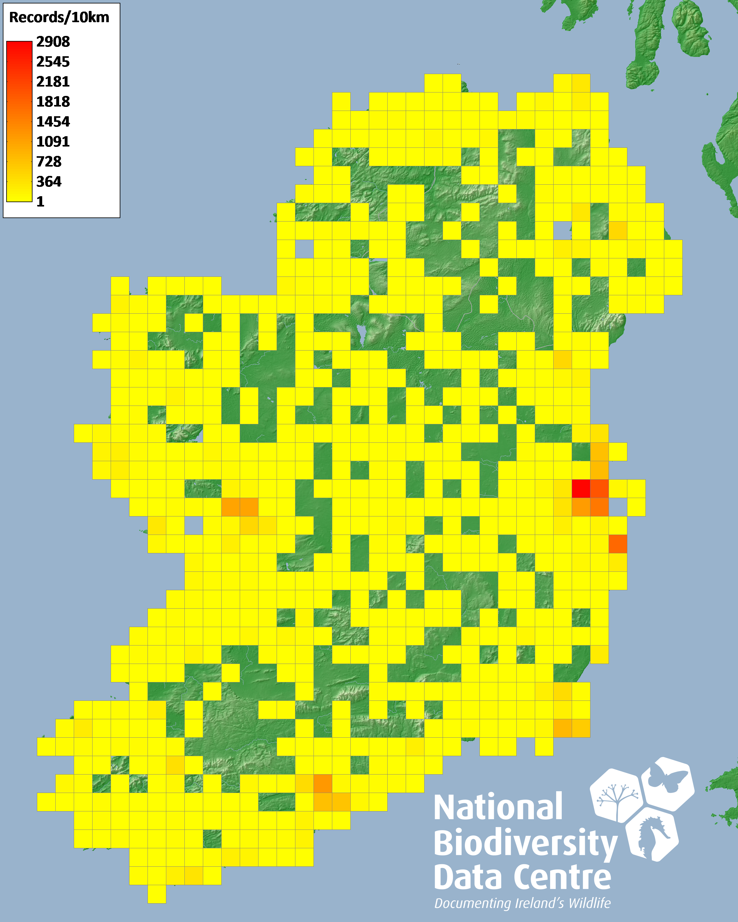 Distribution of the number of records recorded within each 10km grid square (ITM).Marine Map - 50km