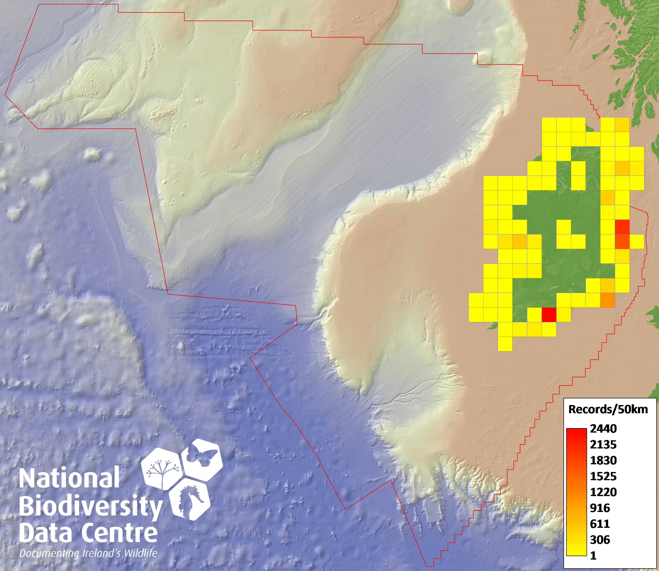 Distribution of the number of records recorded within each 10km grid square (ITM).Marine Map - 50km