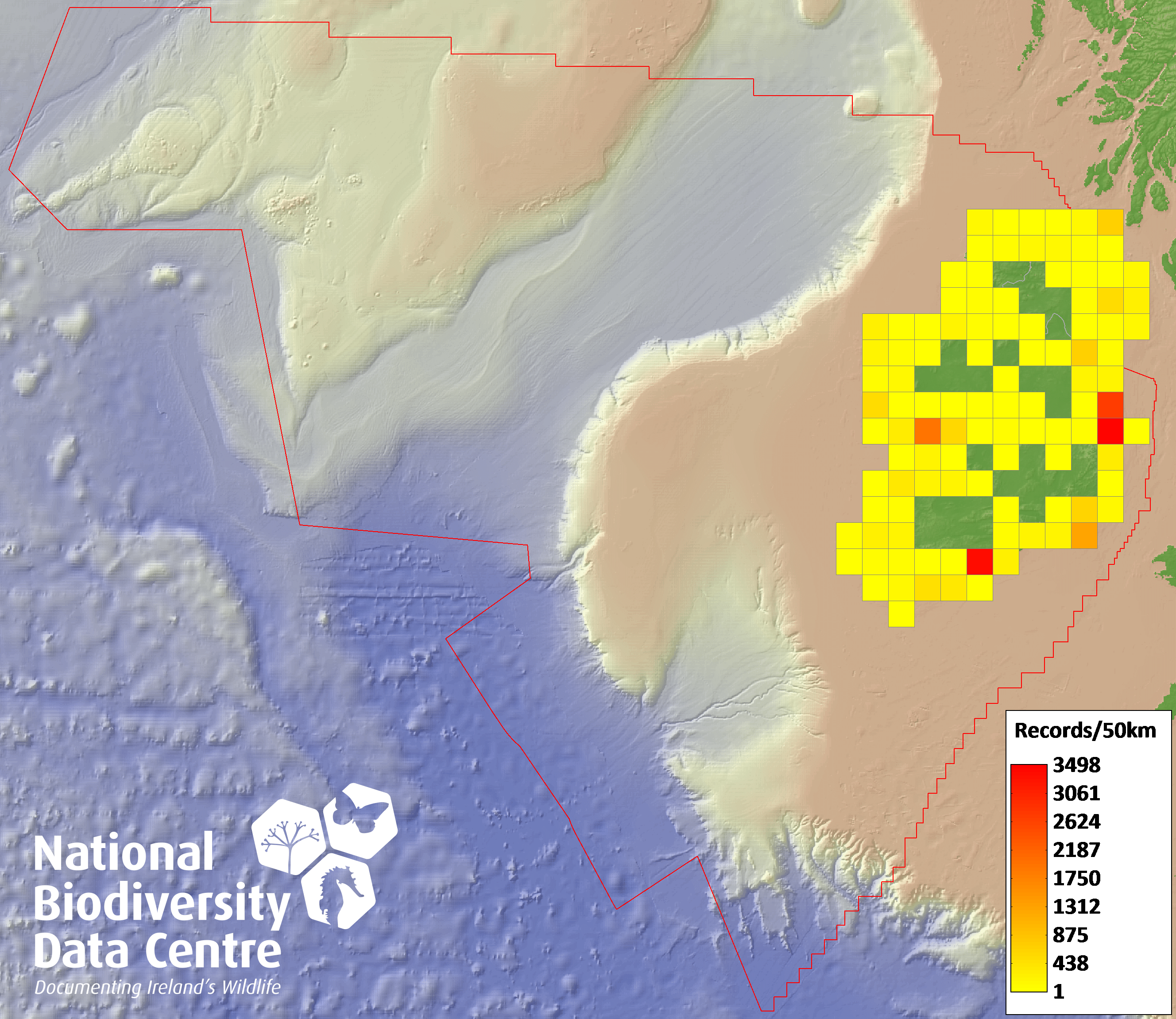Distribution of the number of records recorded within each 10km grid square (ITM).Marine Map - 50km