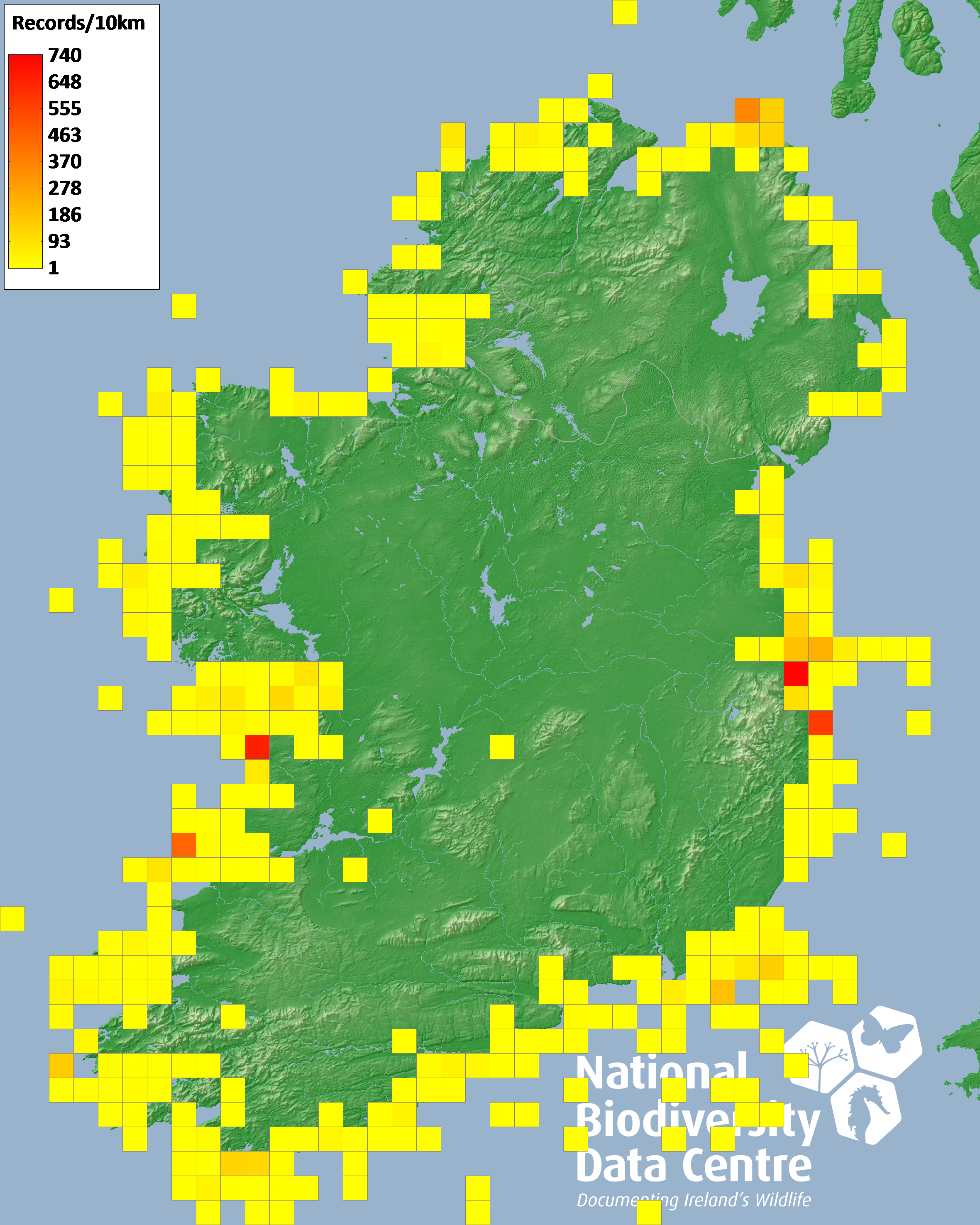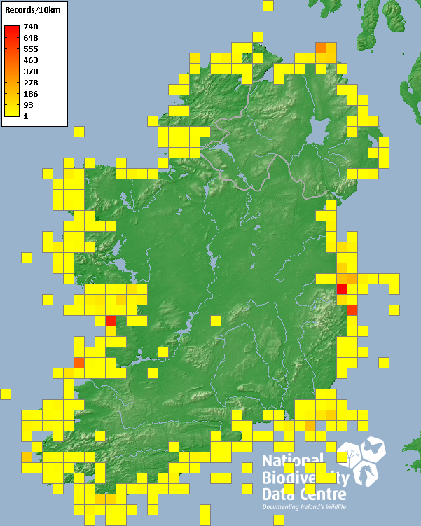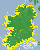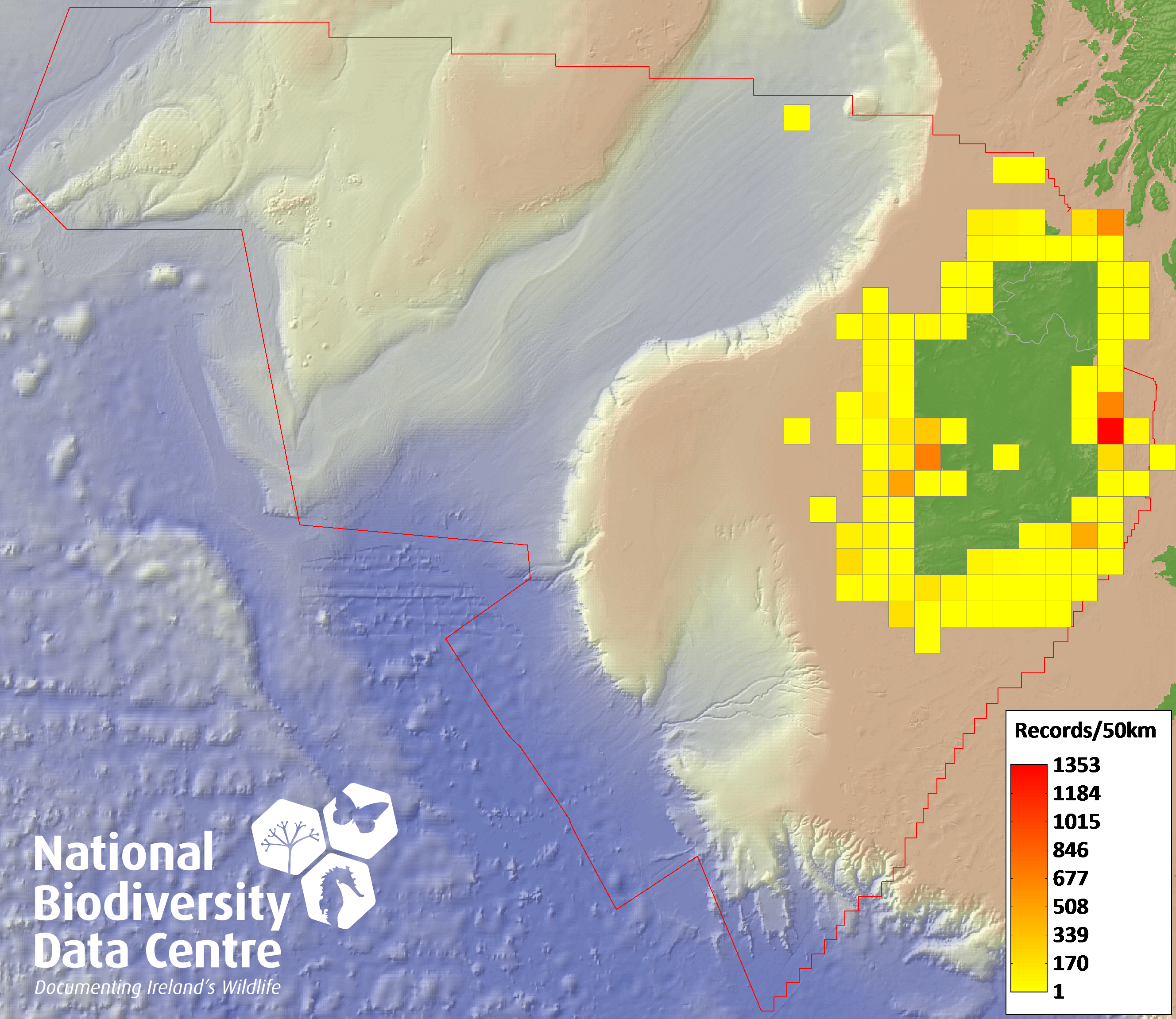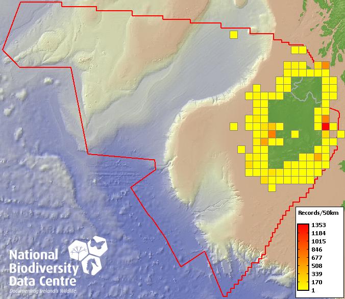 Distribution of the number of records recorded within each 10km grid square (ITM).Marine Map - 50km