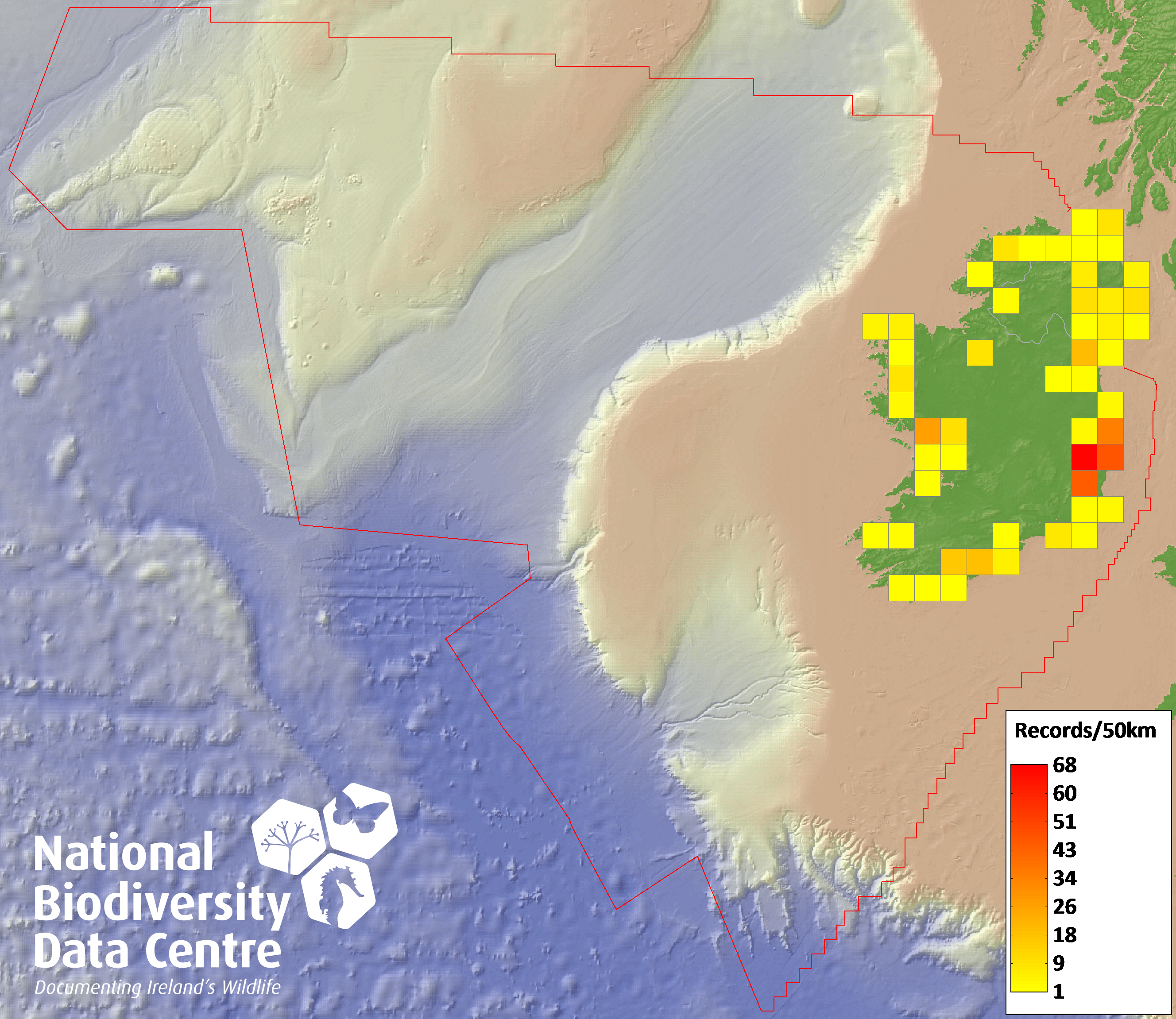 Distribution of the number of records recorded within each 10km grid square (ITM).Marine Map - 50km