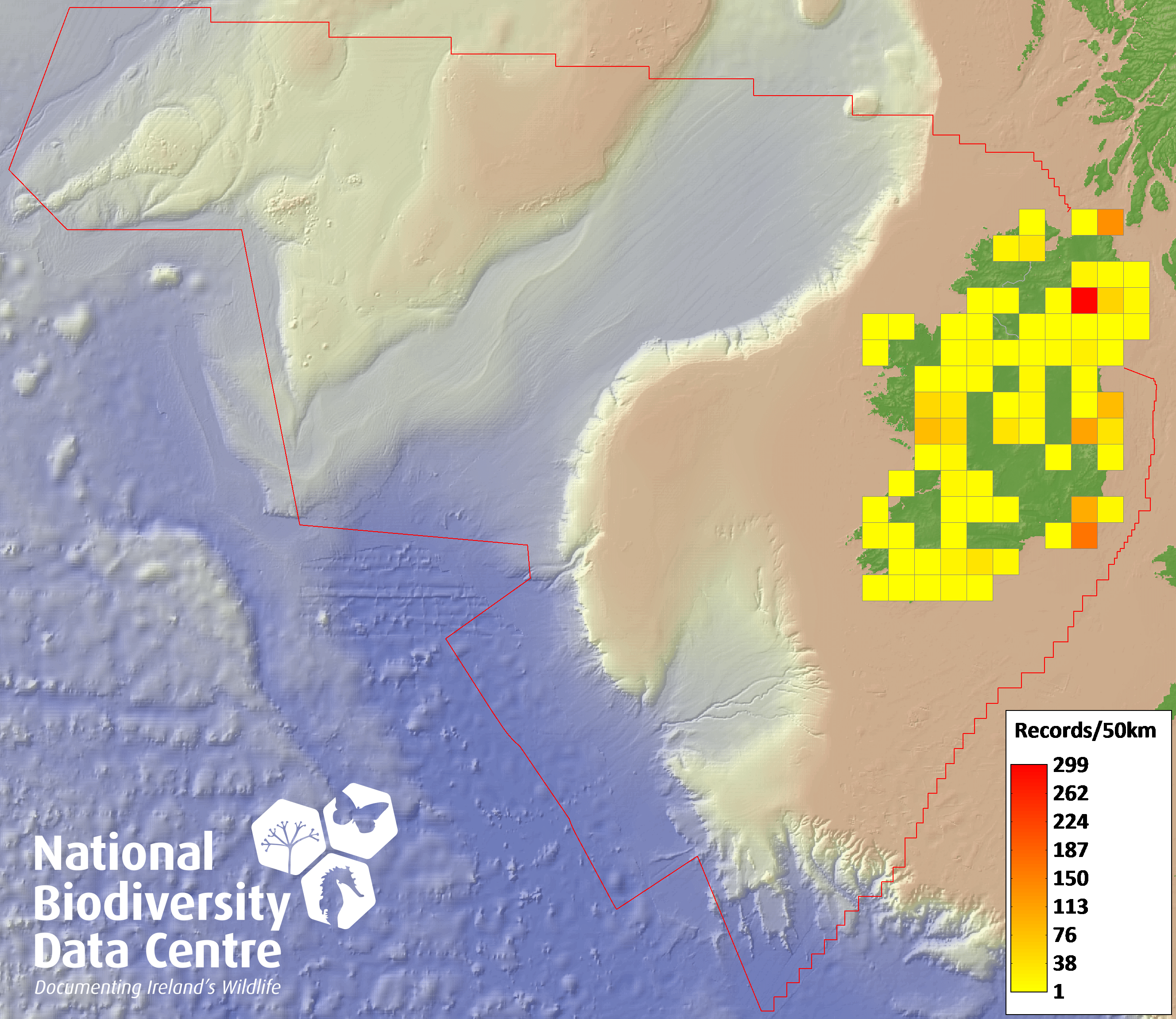 Distribution of the number of records recorded within each 10km grid square (ITM).Marine Map - 50km