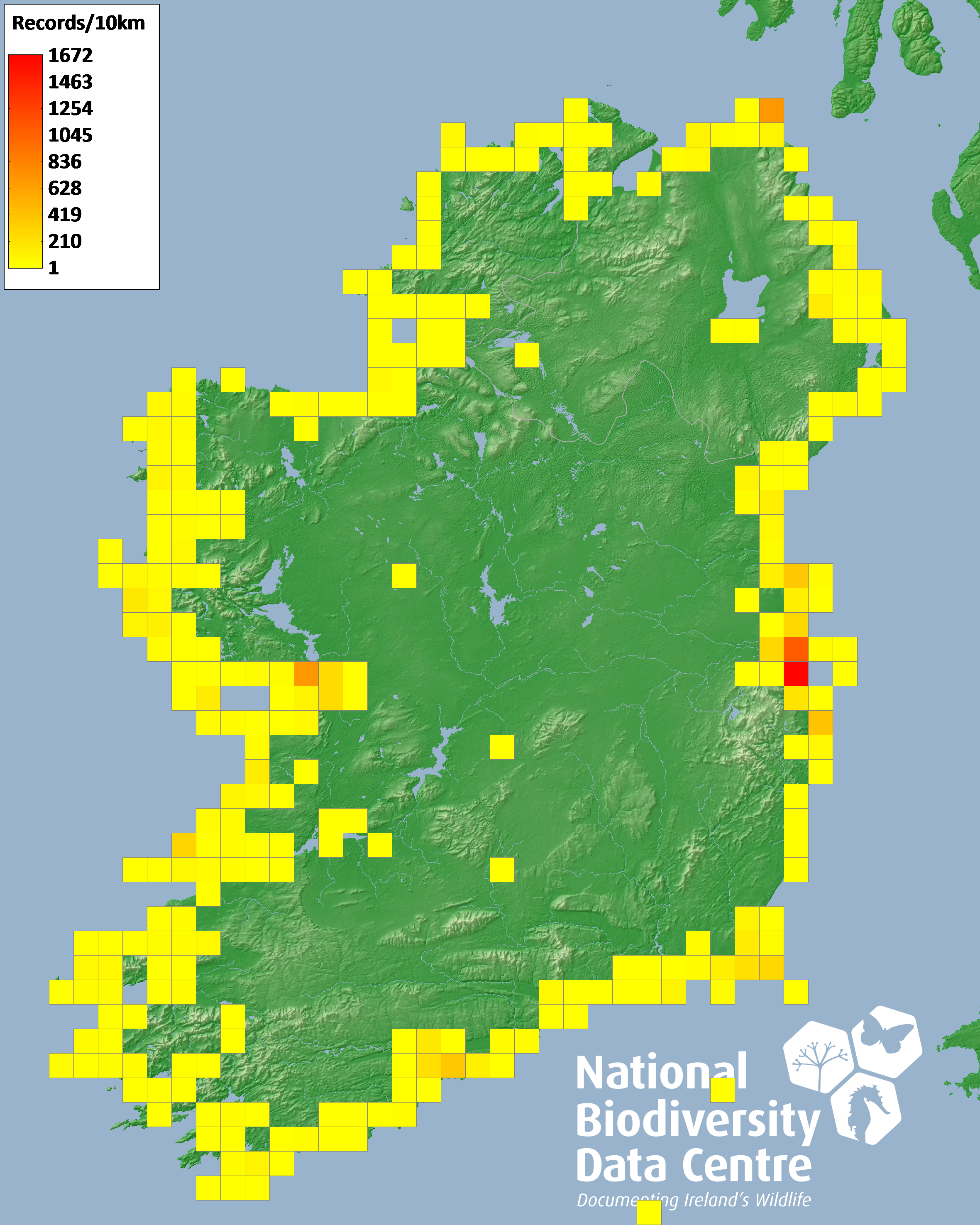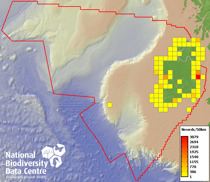 Distribution of the number of records recorded within each 10km grid square (ITM).Marine Map - 50km
