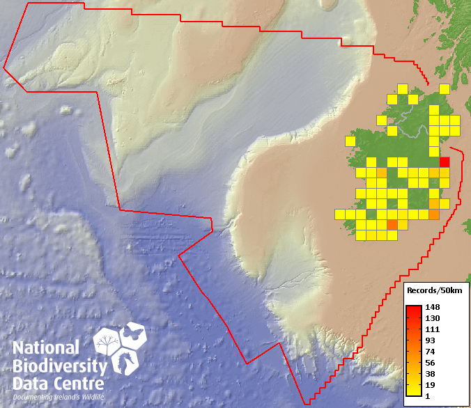 Distribution of the number of records recorded within each 10km grid square (ITM).Marine Map - 50km