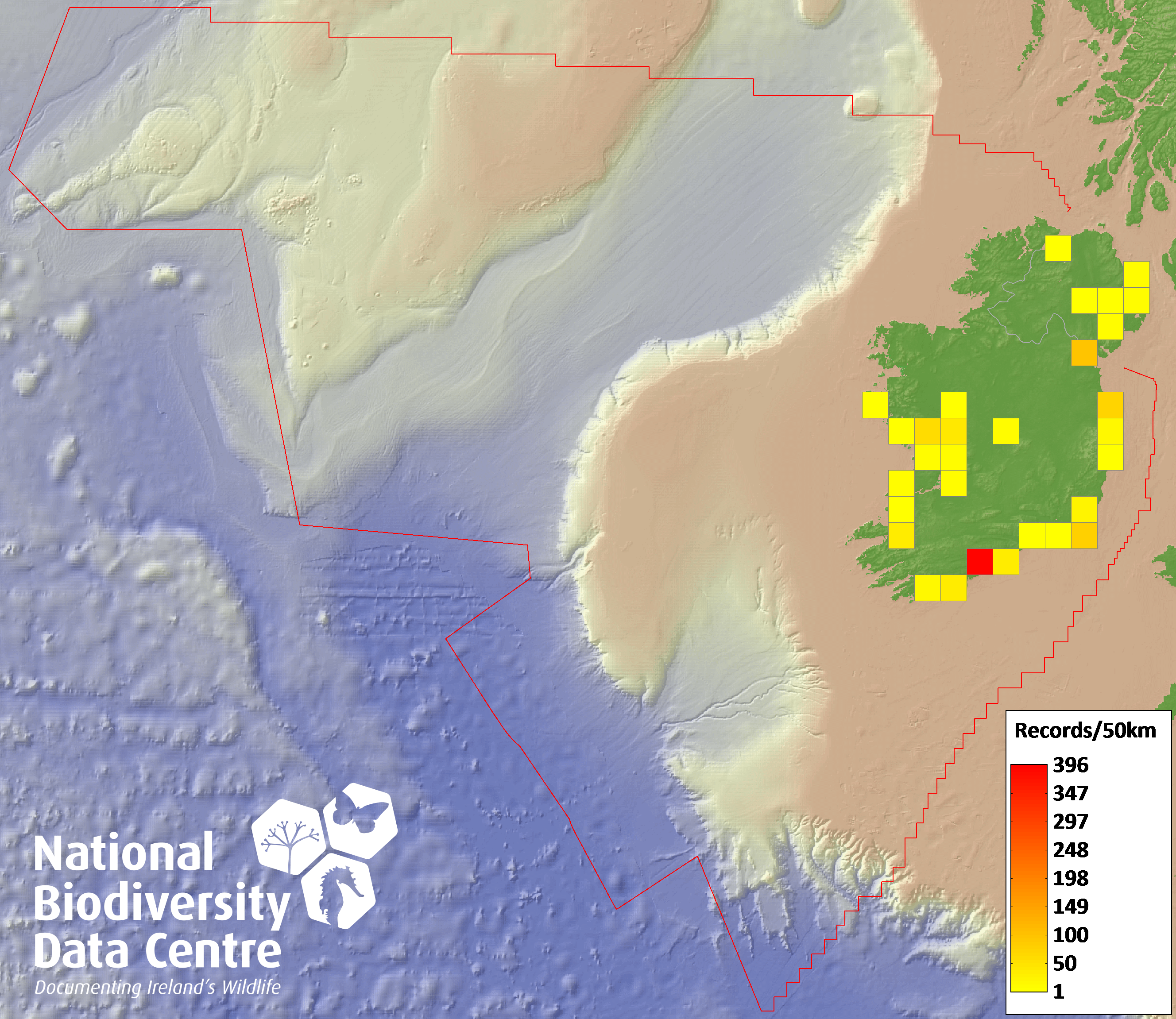 Distribution of the number of records recorded within each 10km grid square (ITM).Marine Map - 50km