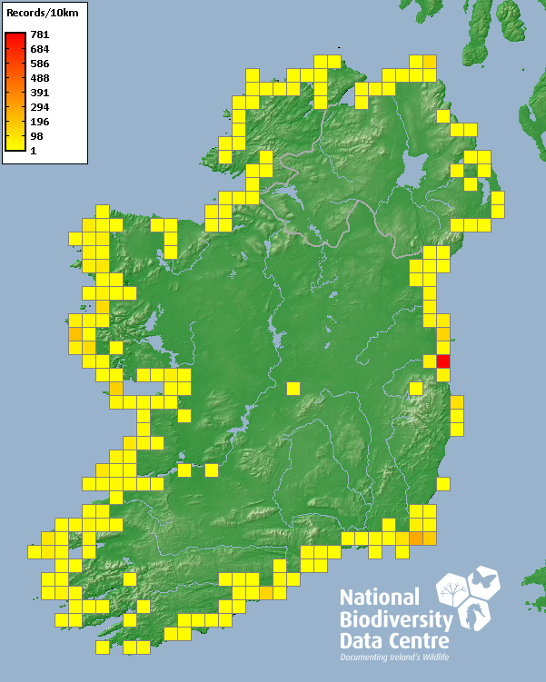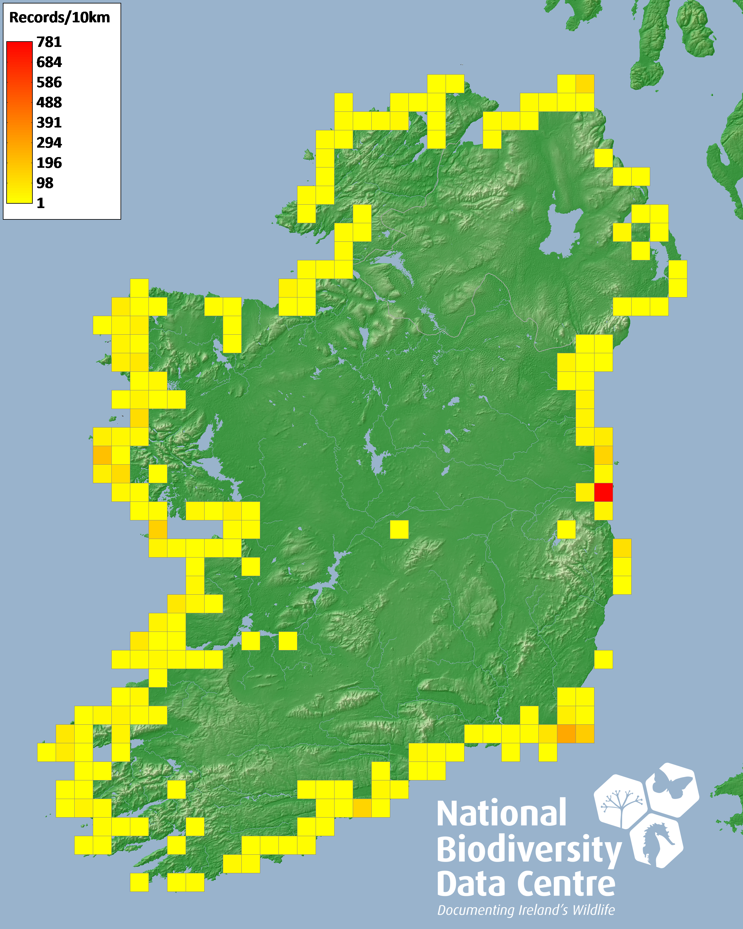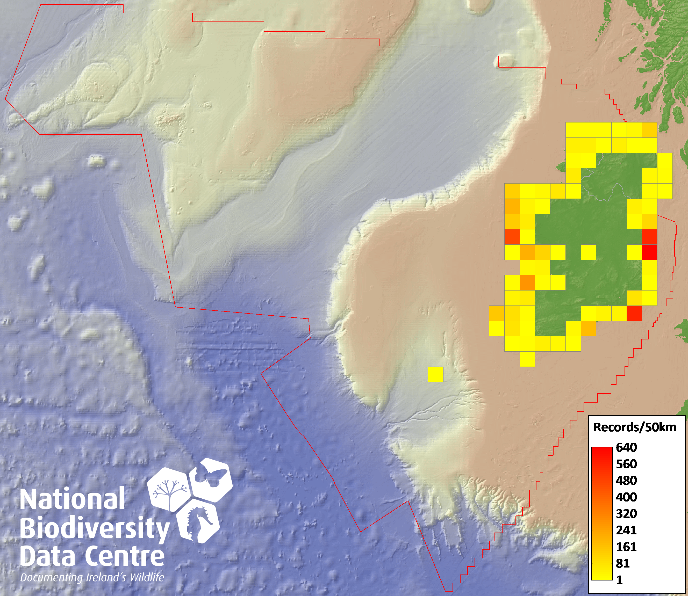 Distribution of the number of records recorded within each 10km grid square (ITM).Marine Map - 50km