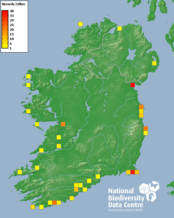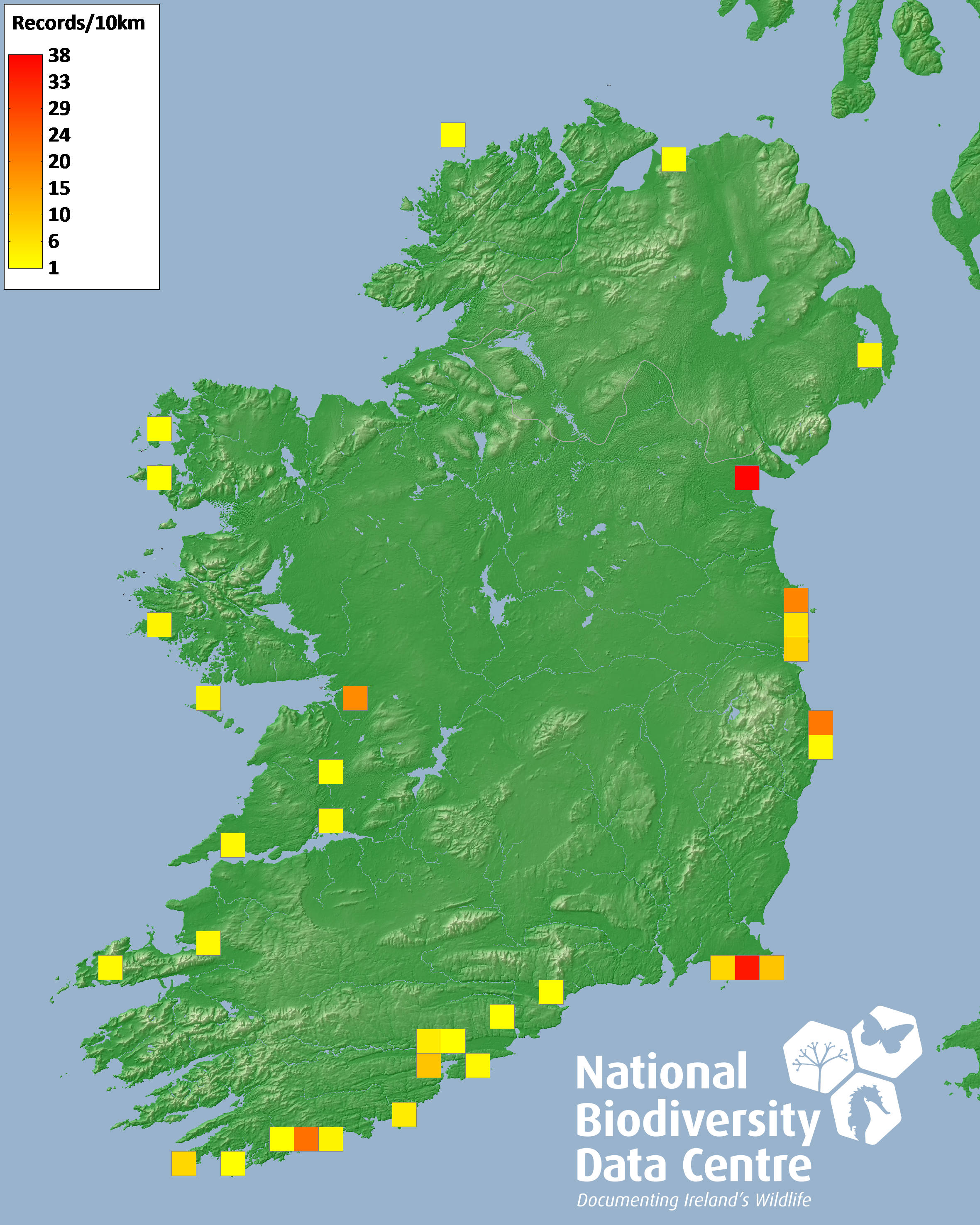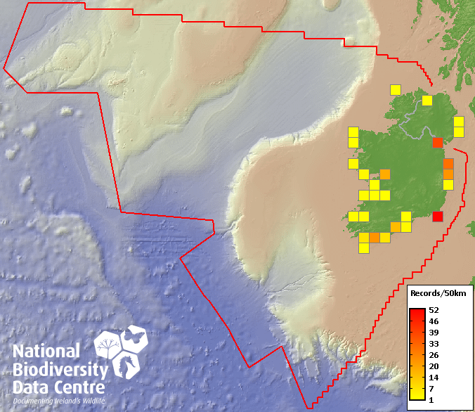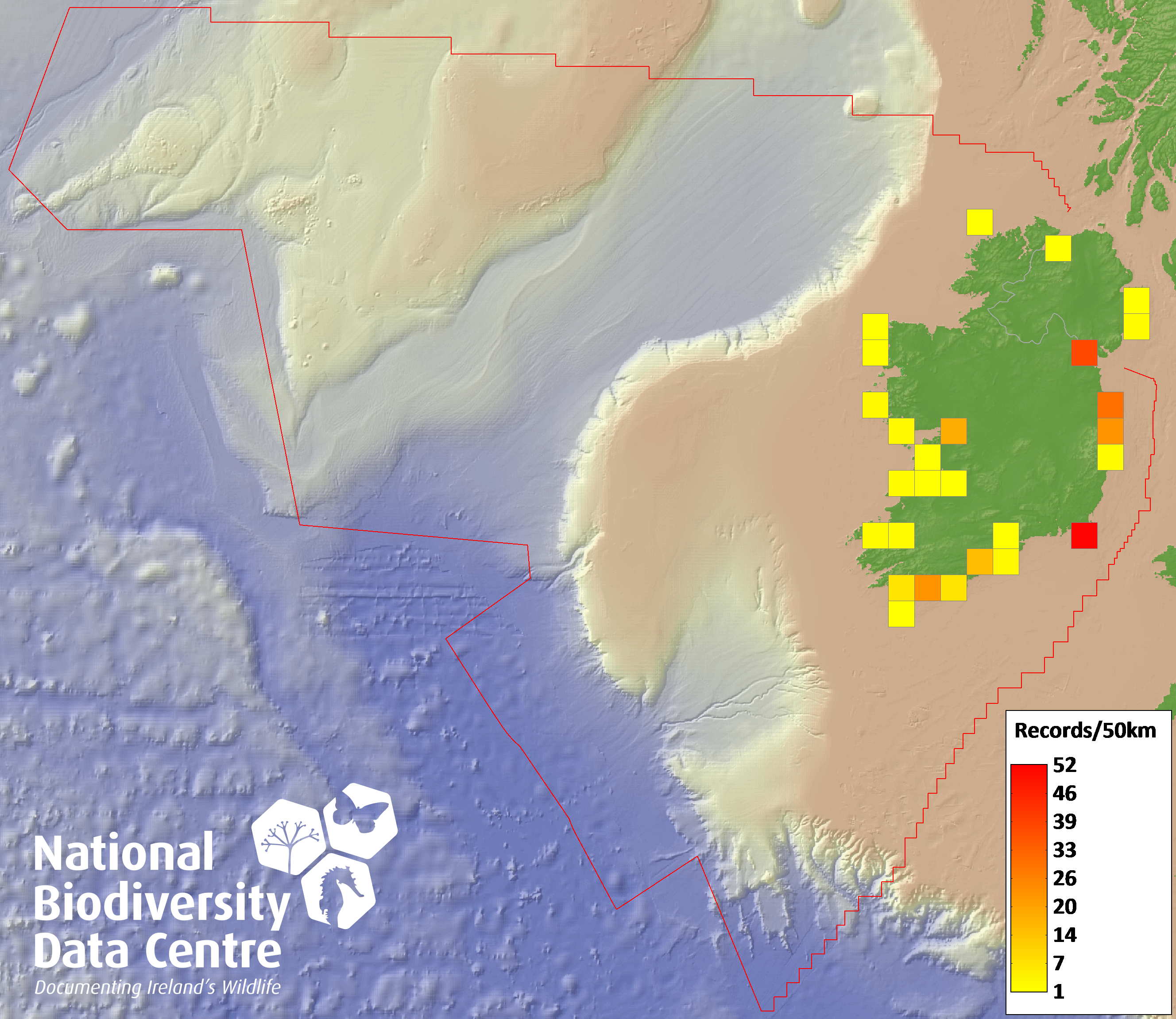 Distribution of the number of records recorded within each 10km grid square (ITM).Marine Map - 50km
