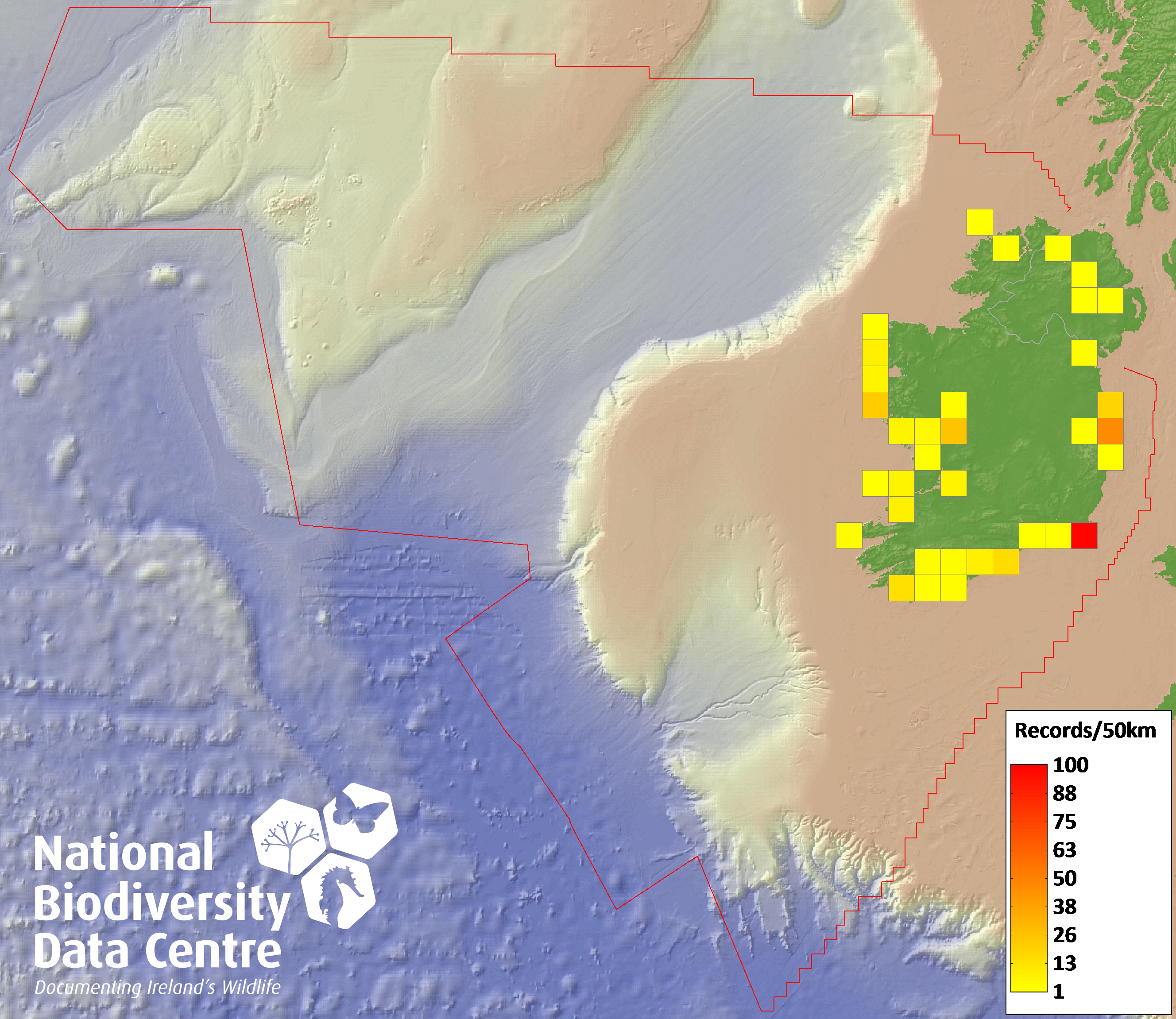 Distribution of the number of records recorded within each 10km grid square (ITM).Marine Map - 50km