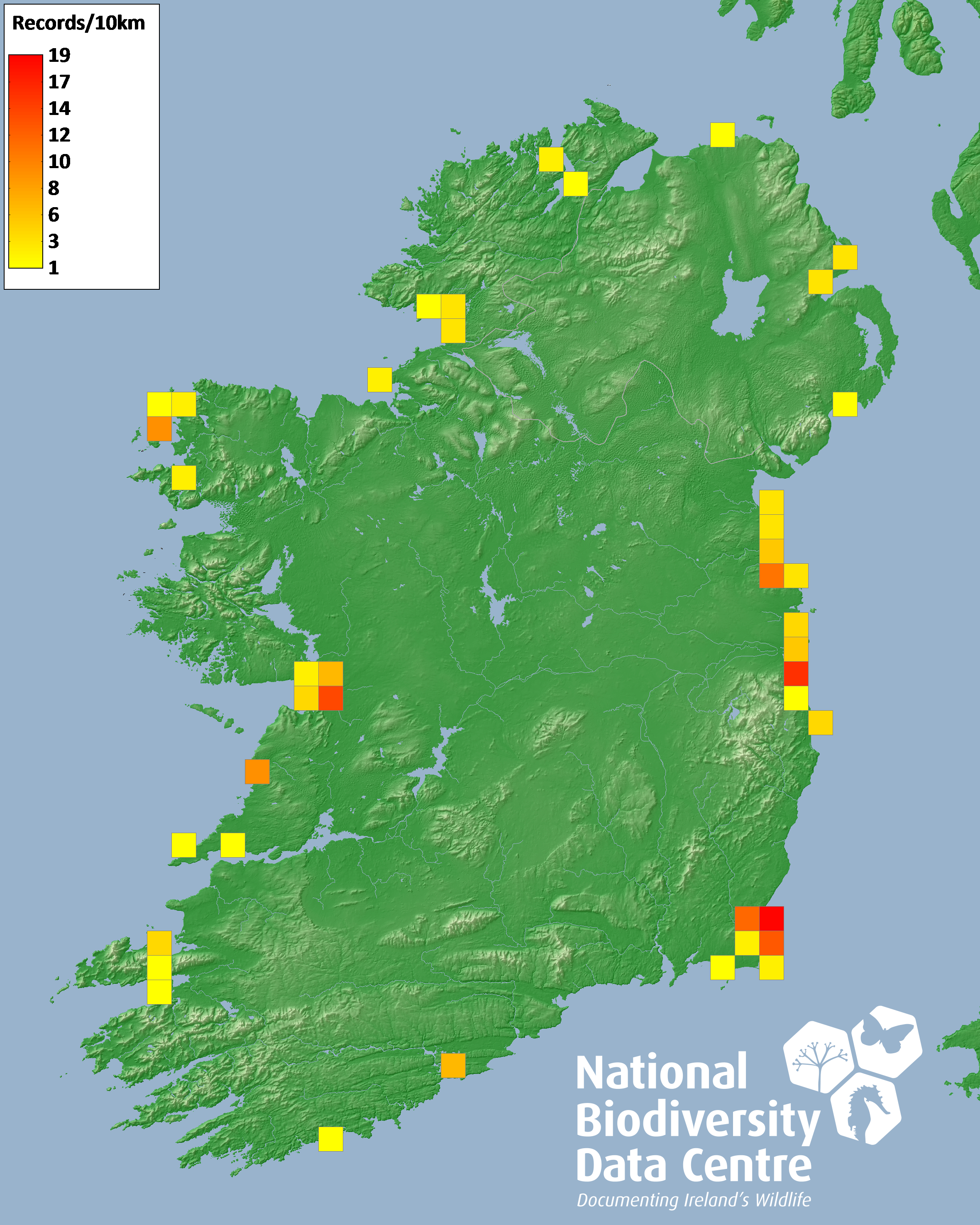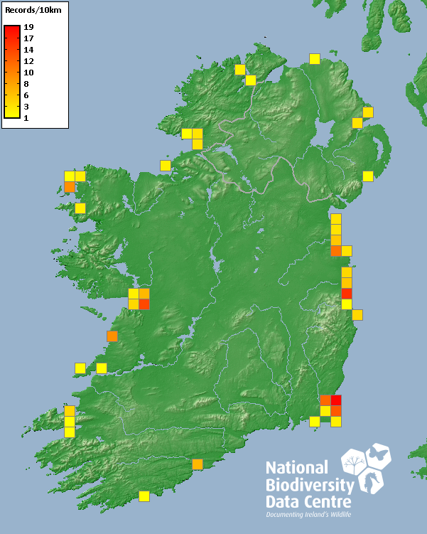 Distribution of the number of records recorded within each 10km grid square (ITM).Marine Map - 50km