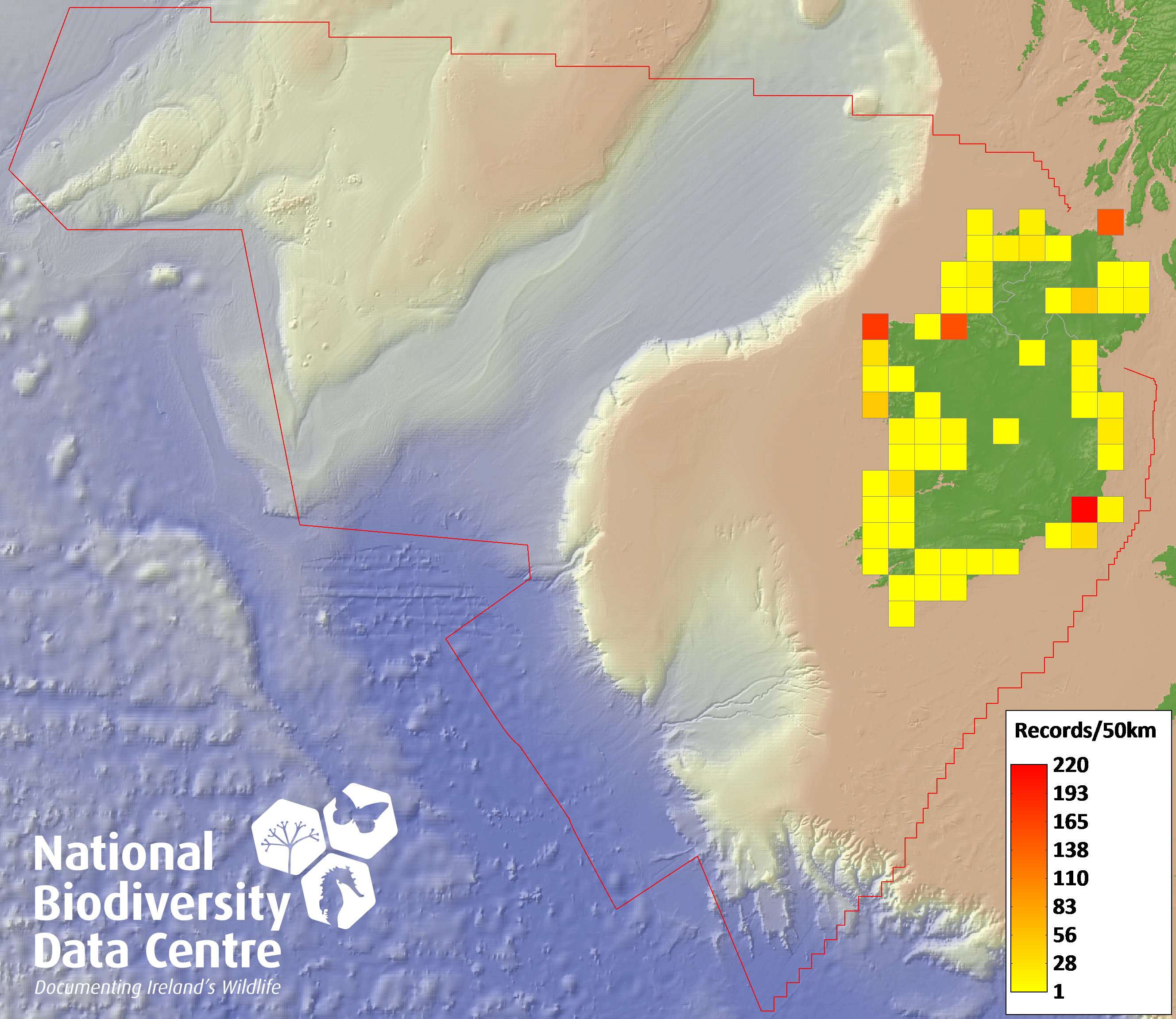 Distribution of the number of records recorded within each 10km grid square (ITM).Marine Map - 50km