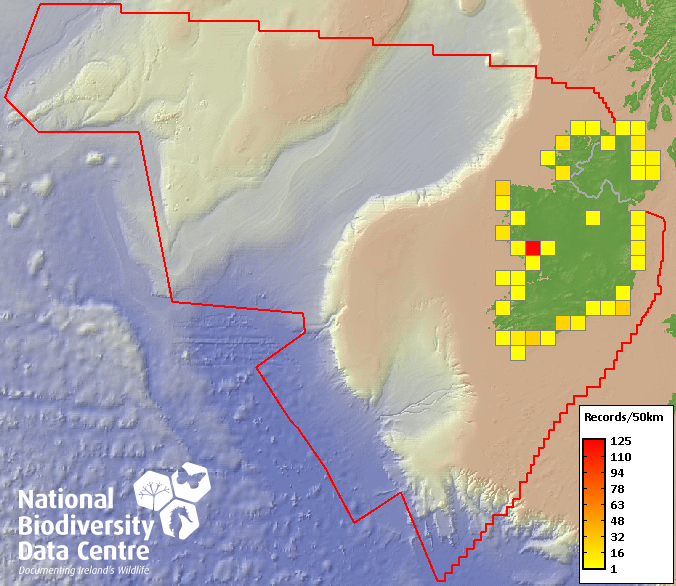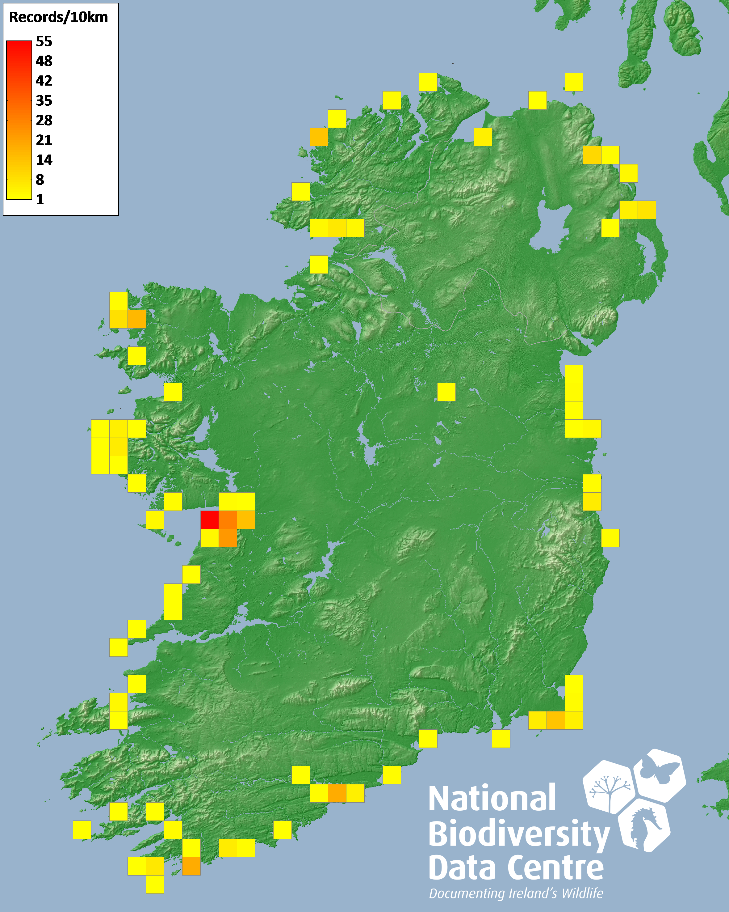 Distribution of the number of records recorded within each 10km grid square (ITM).Marine Map - 50km
