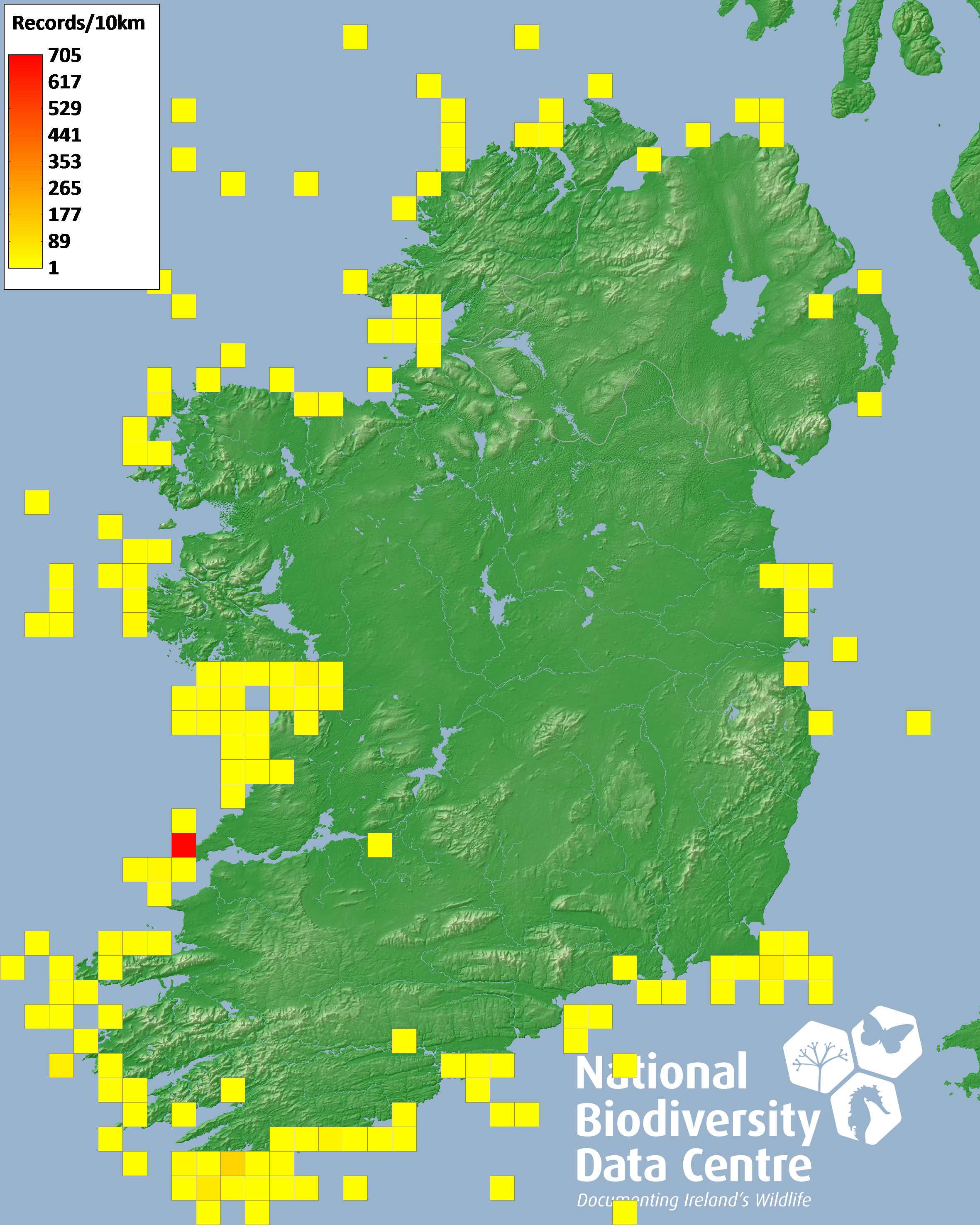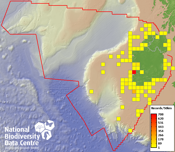Distribution of the number of records recorded within each 10km grid square (ITM).Marine Map - 50km