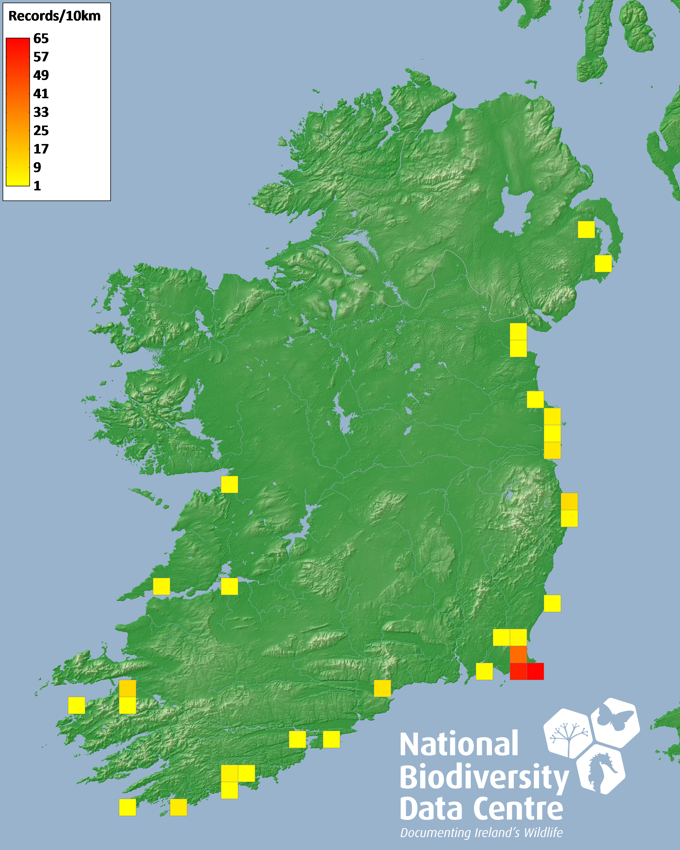 Distribution of the number of records recorded within each 10km grid square (ITM).Marine Map - 50km
