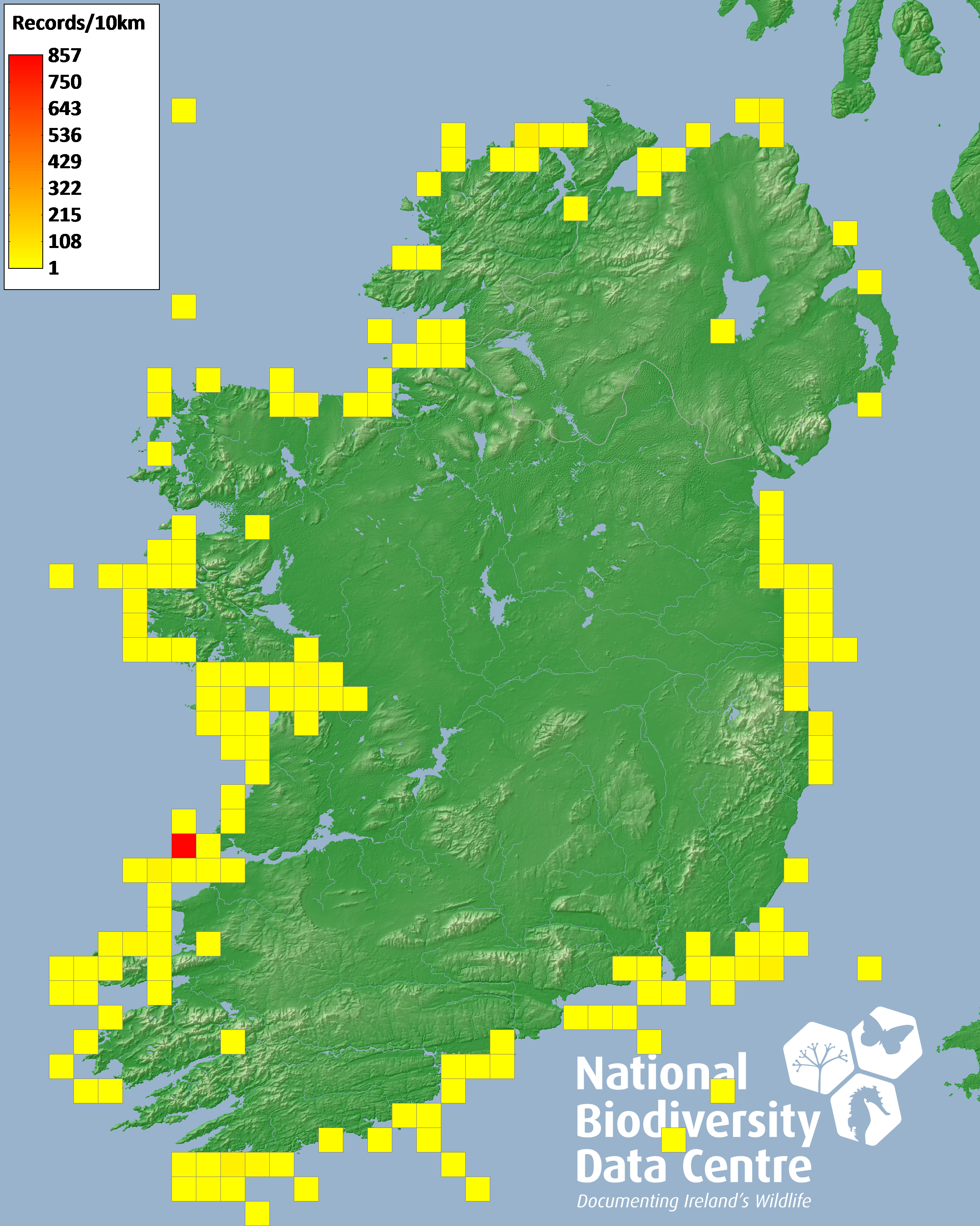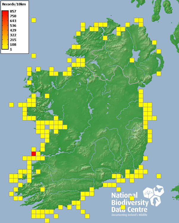 Distribution of the number of records recorded within each 10km grid square (ITM).Marine Map - 50km