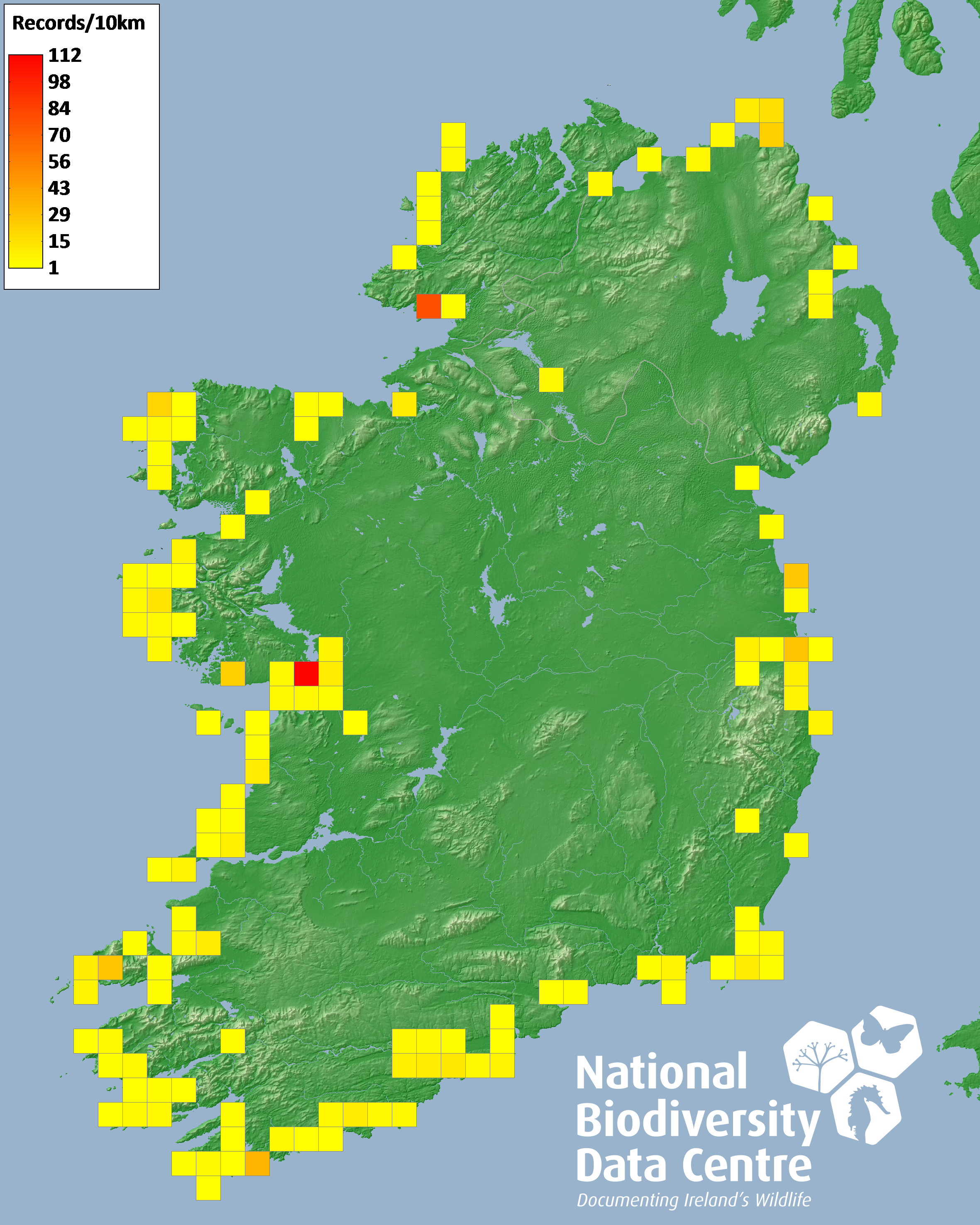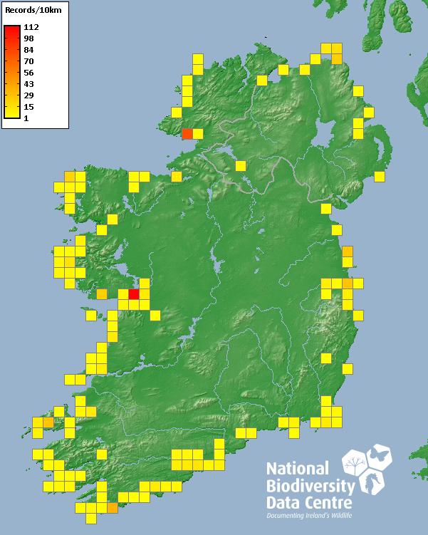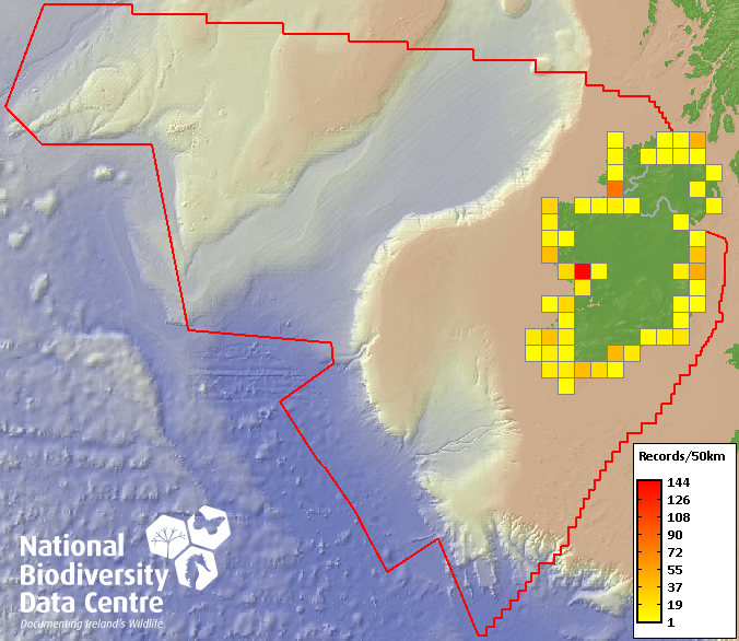Distribution of the number of records recorded within each 10km grid square (ITM).Marine Map - 50km