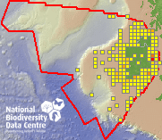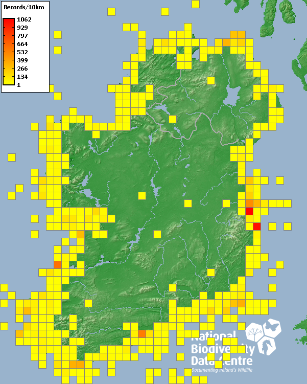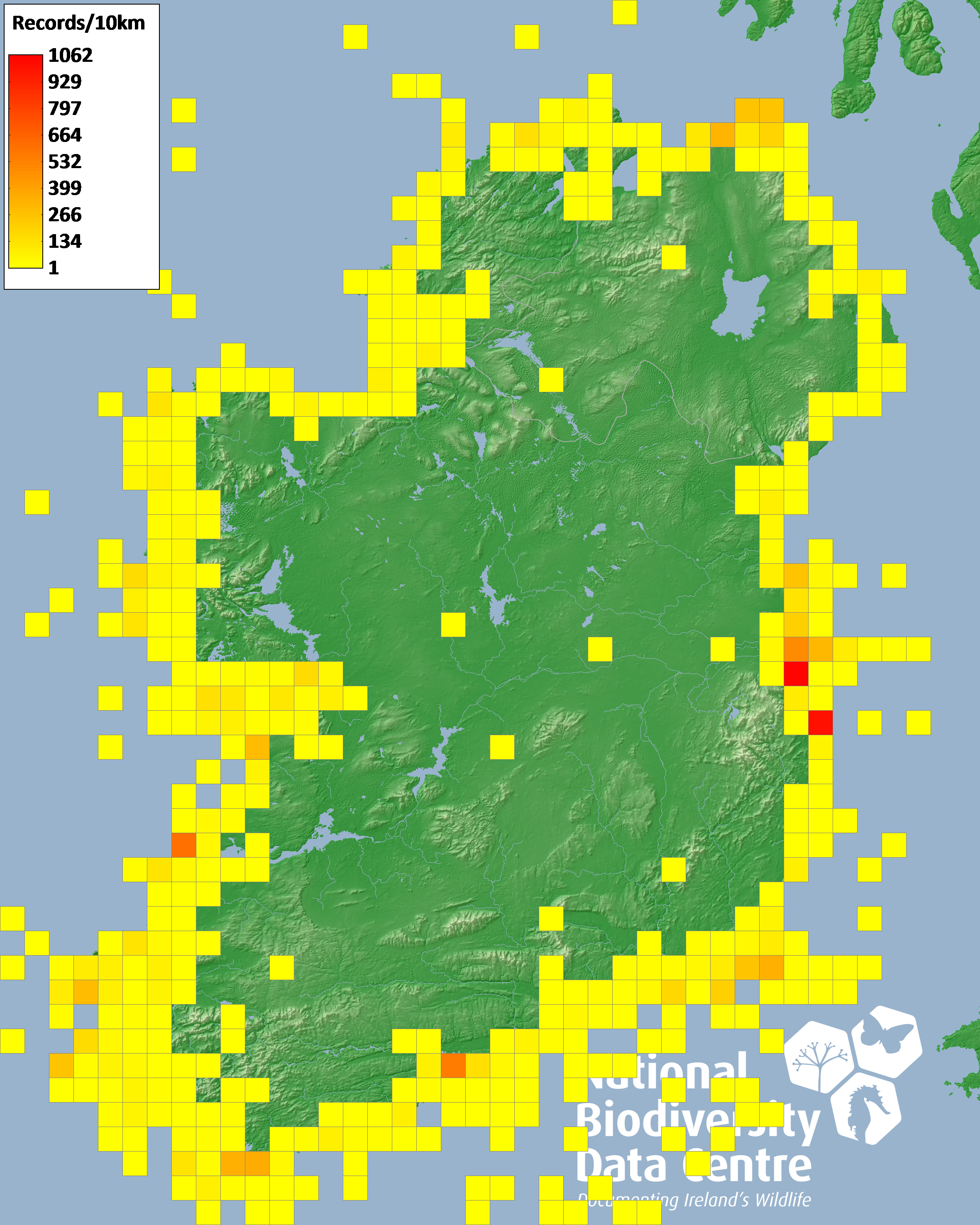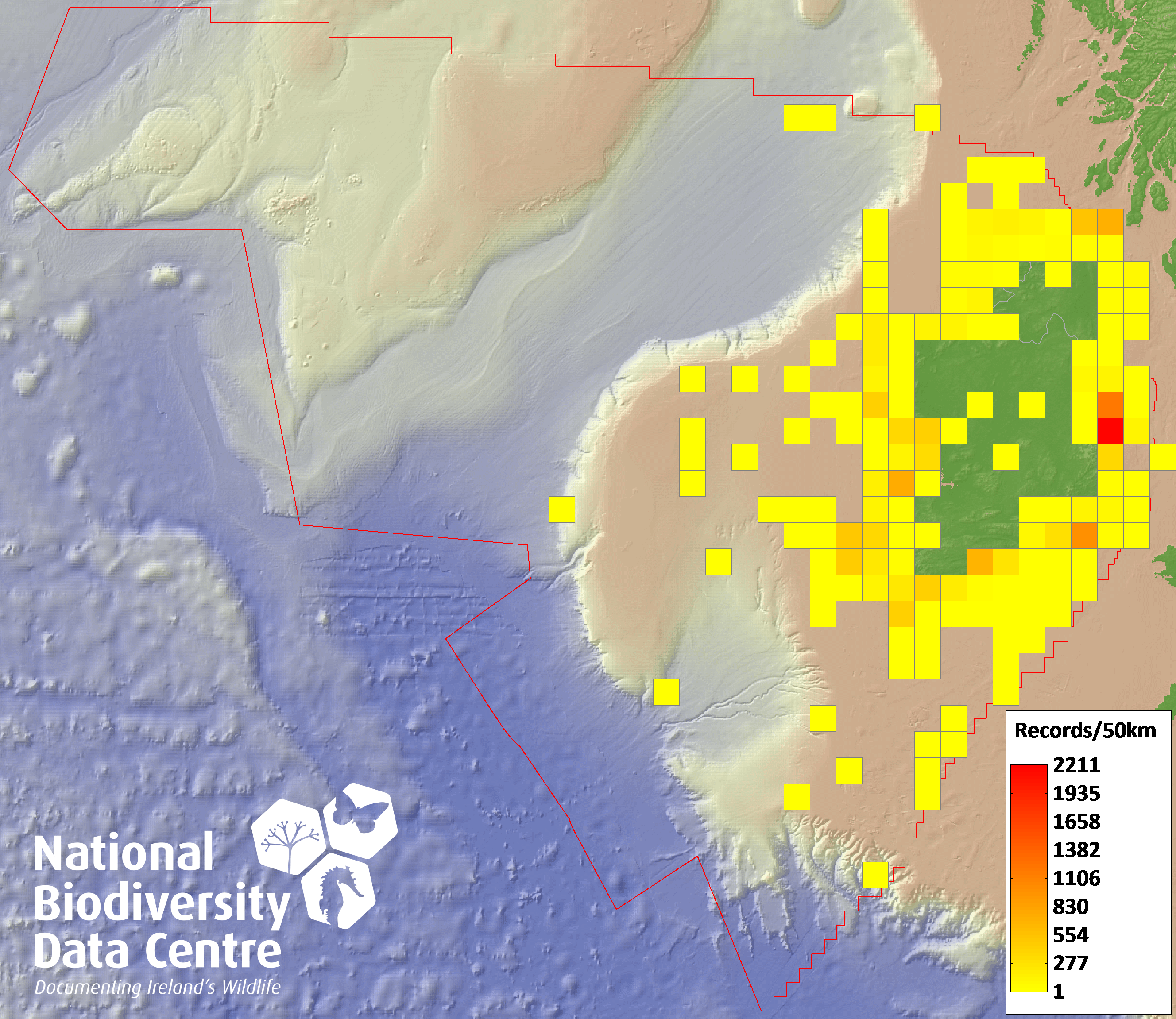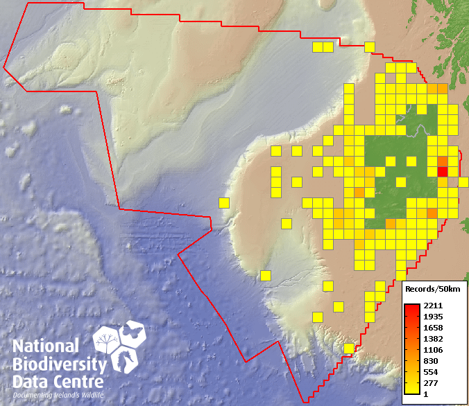 Distribution of the number of records recorded within each 10km grid square (ITM).Marine Map - 50km