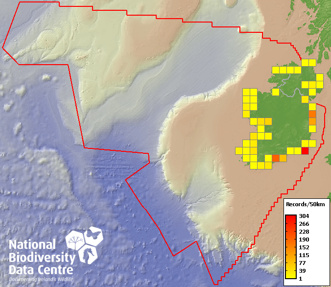 Distribution of the number of records recorded within each 10km grid square (ITM).Marine Map - 50km